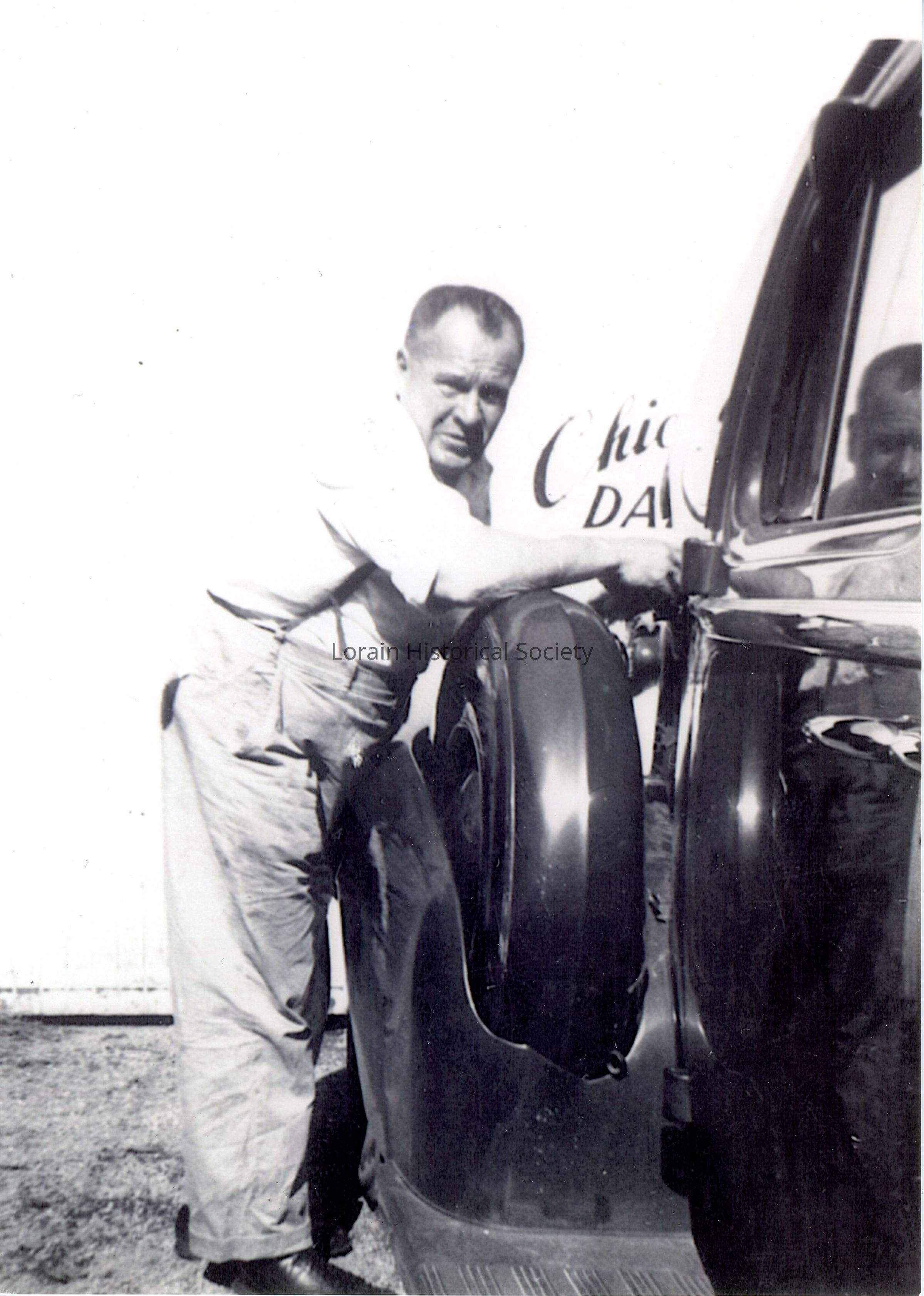 Image of a man named Stephen Chick leaning over a car or vehicle for Chick's Dairy.