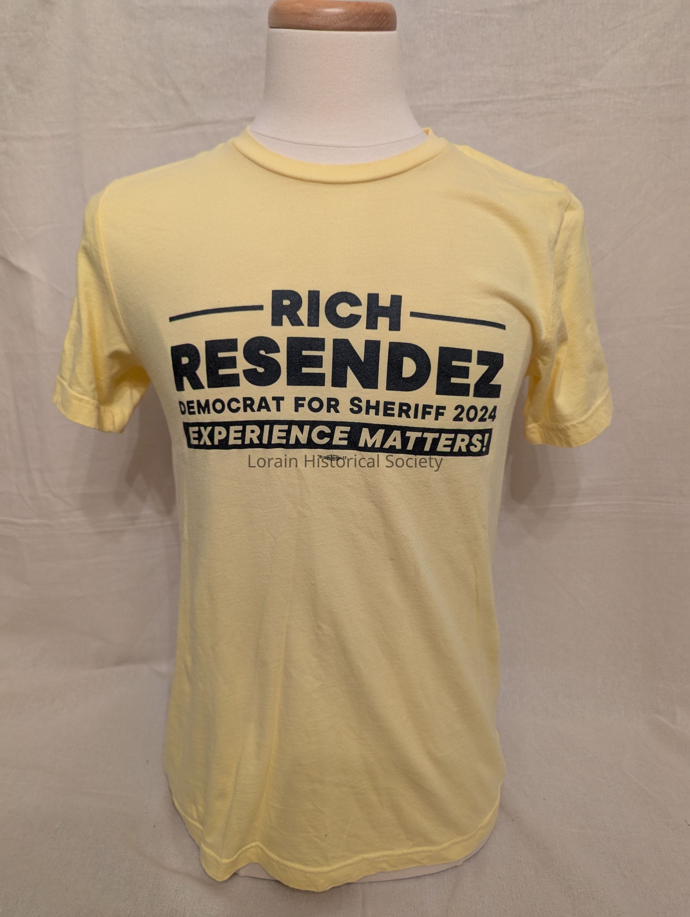 Pale yellow, ladies cut with black lettering, repeated on back; Rich Resendez Democrat for Sheriff 2024; Experience Matters.Context