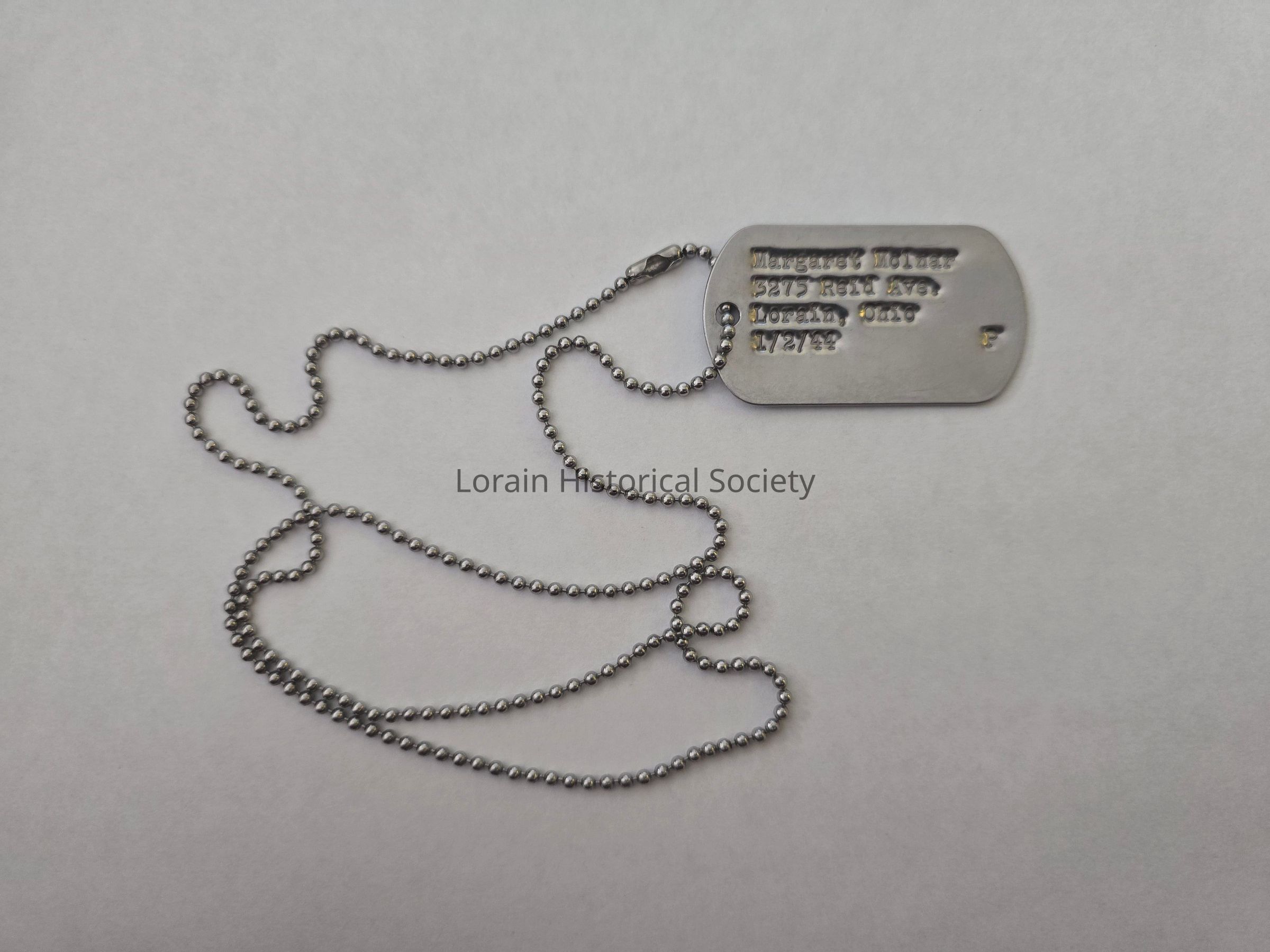 Military-style dog tags given to students in elementary school in Lorain during the Cold War era in the 1950s. These tags were worn by Margaret Molnar at Garfield Elementary in 5th grade (1953-1954).