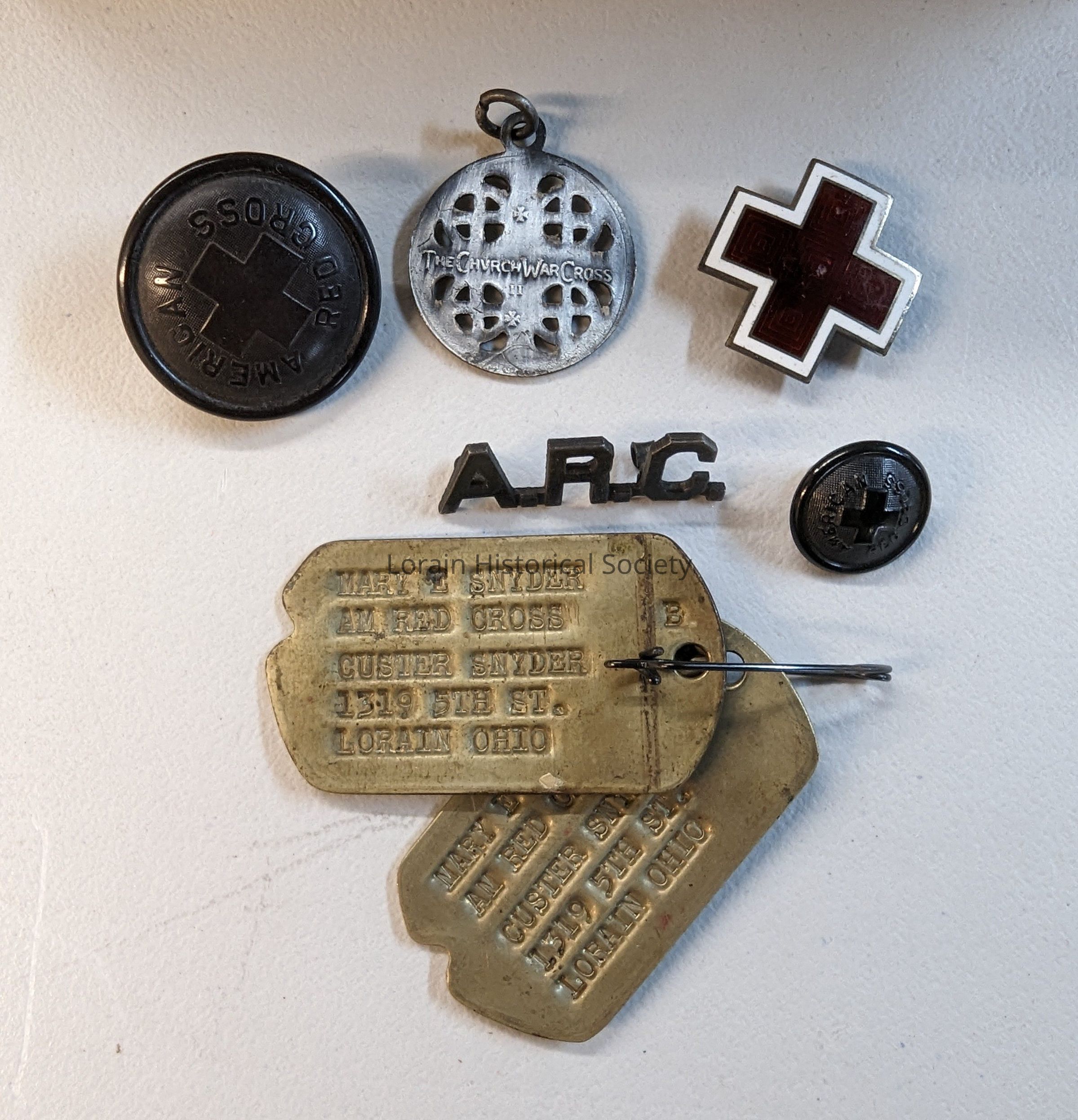 Mary Elizabeth Keller's dog tags. RC insignias, pins, buttons and Church of War Cross medal given to her by a patient.Acquisition