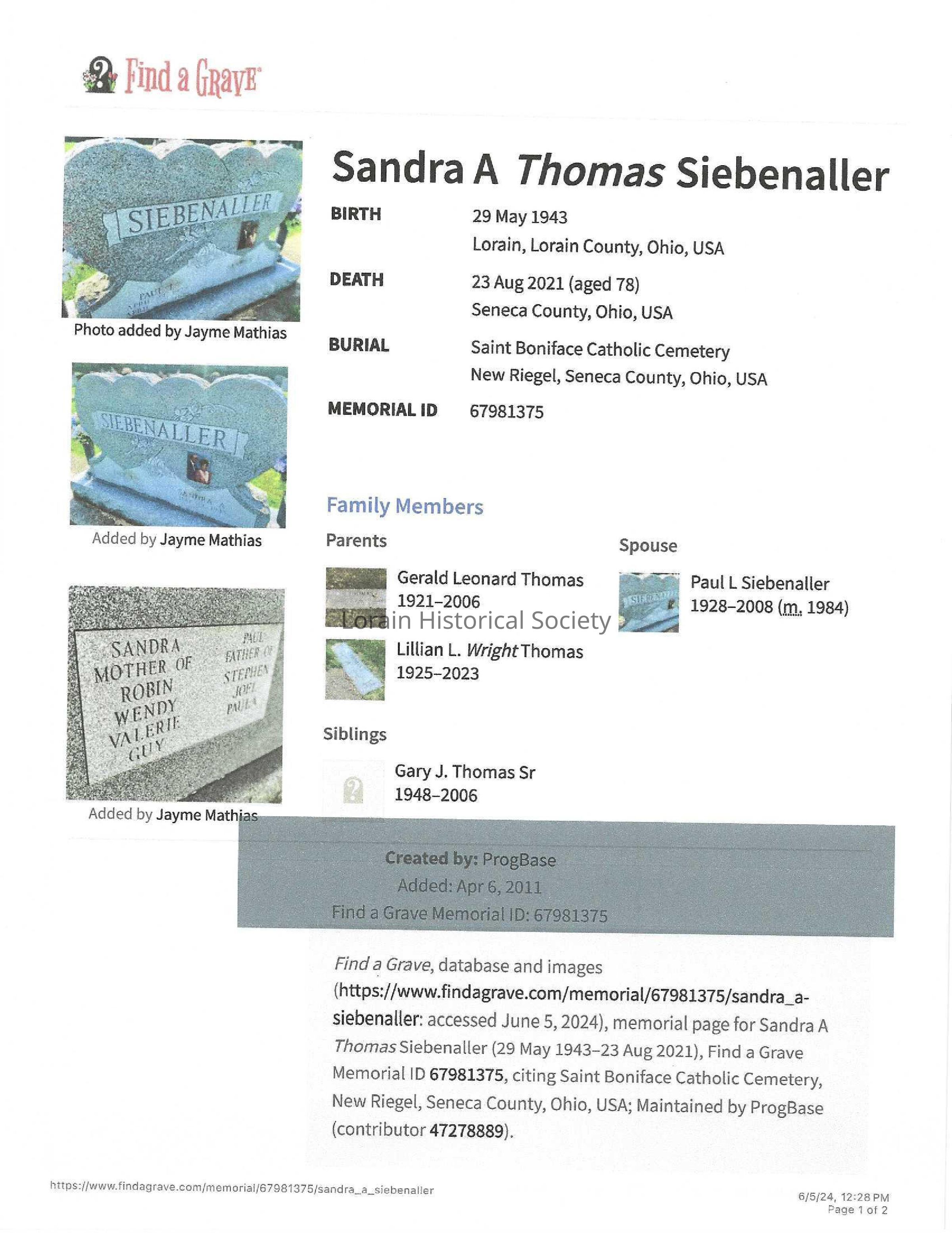 Thomas, Sandra A. Siebenaller obit