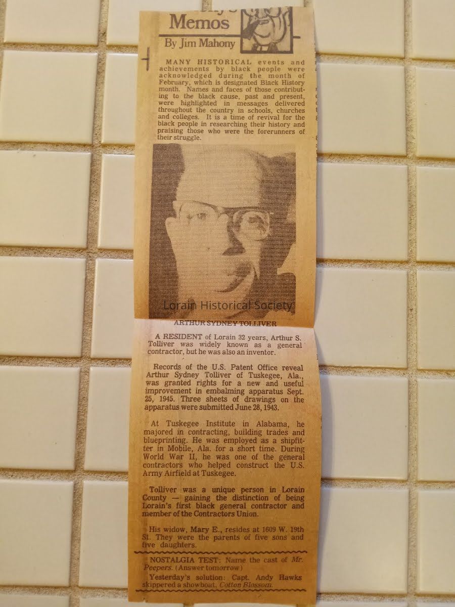 Arthur Sidney Adams Tolliver was a craftsman who built many homes in Lorain from the ground up, including 1609 W. 19th Street and 1100 W. 20th Street. He specialized in brick homes and had a special design for chimneys. He was born in Lebanon, TN and attended Tuskegee University for blueprinting and contracting before moving to Cleveland, OH and then Lorain sometime between 1935 and 1945. He assisted with building the airfields that were used by the Tuskegee Airmen during the war.