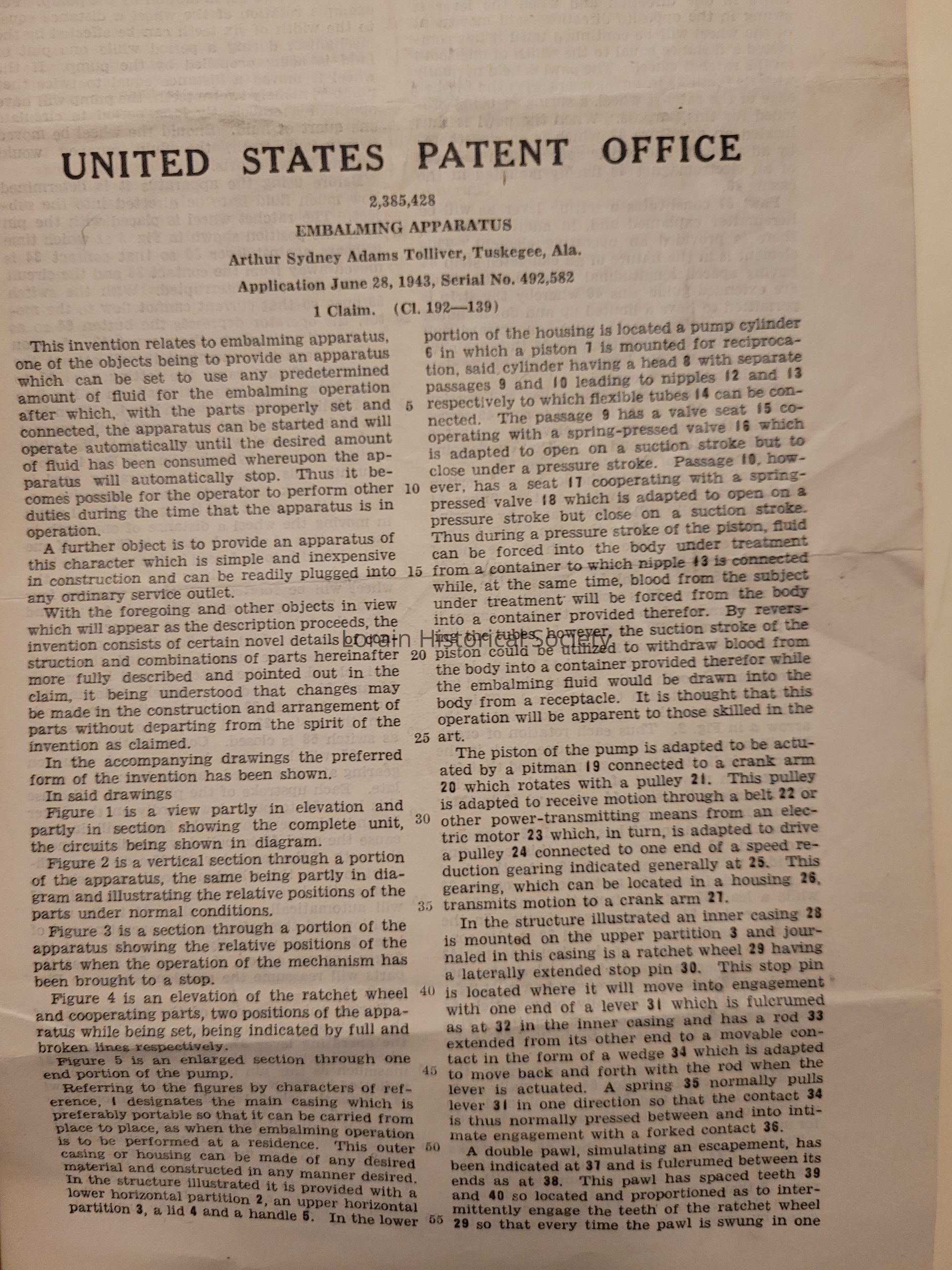 **The patent application was filed in 1943 and granted in 1945. At the time of the application, Tolliver was living in Tuskegee, Alabama.Collection