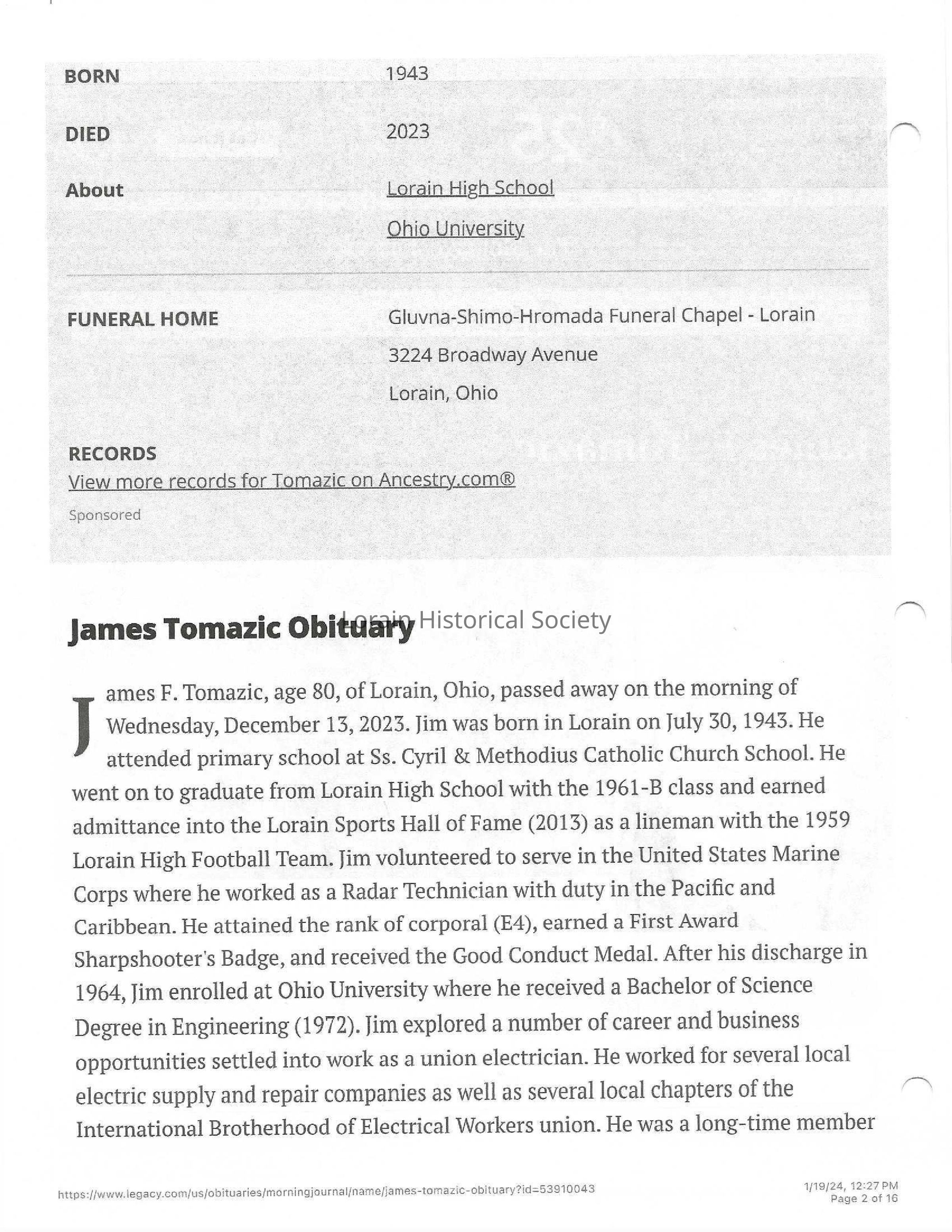 Tomazic, James F. obit