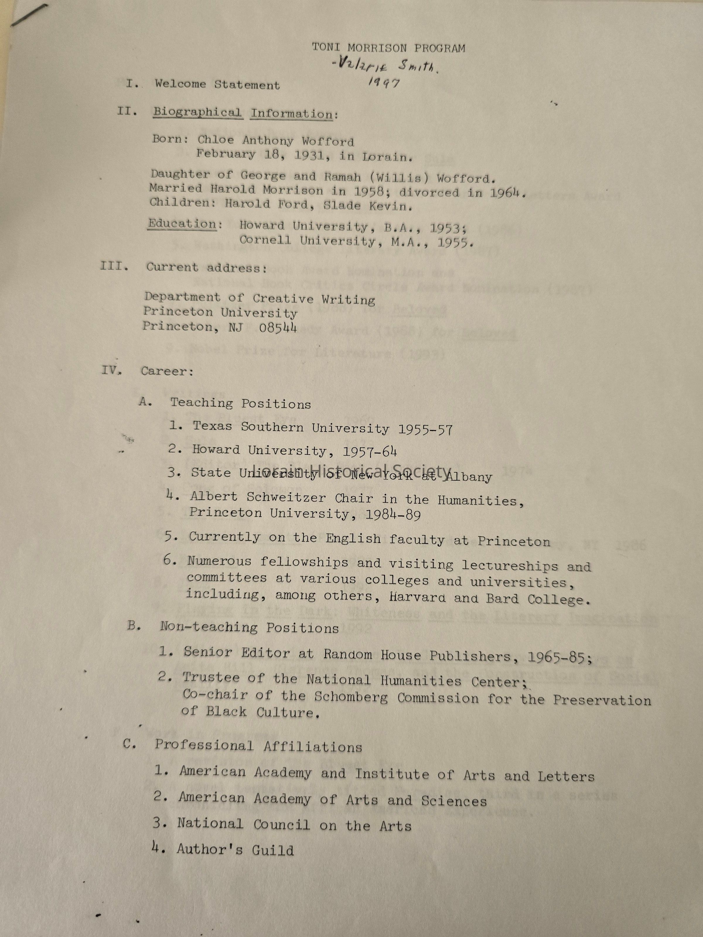 Program notes from presentation by Valerie Smith (Lorain Public Library System), 1997.Acquisition