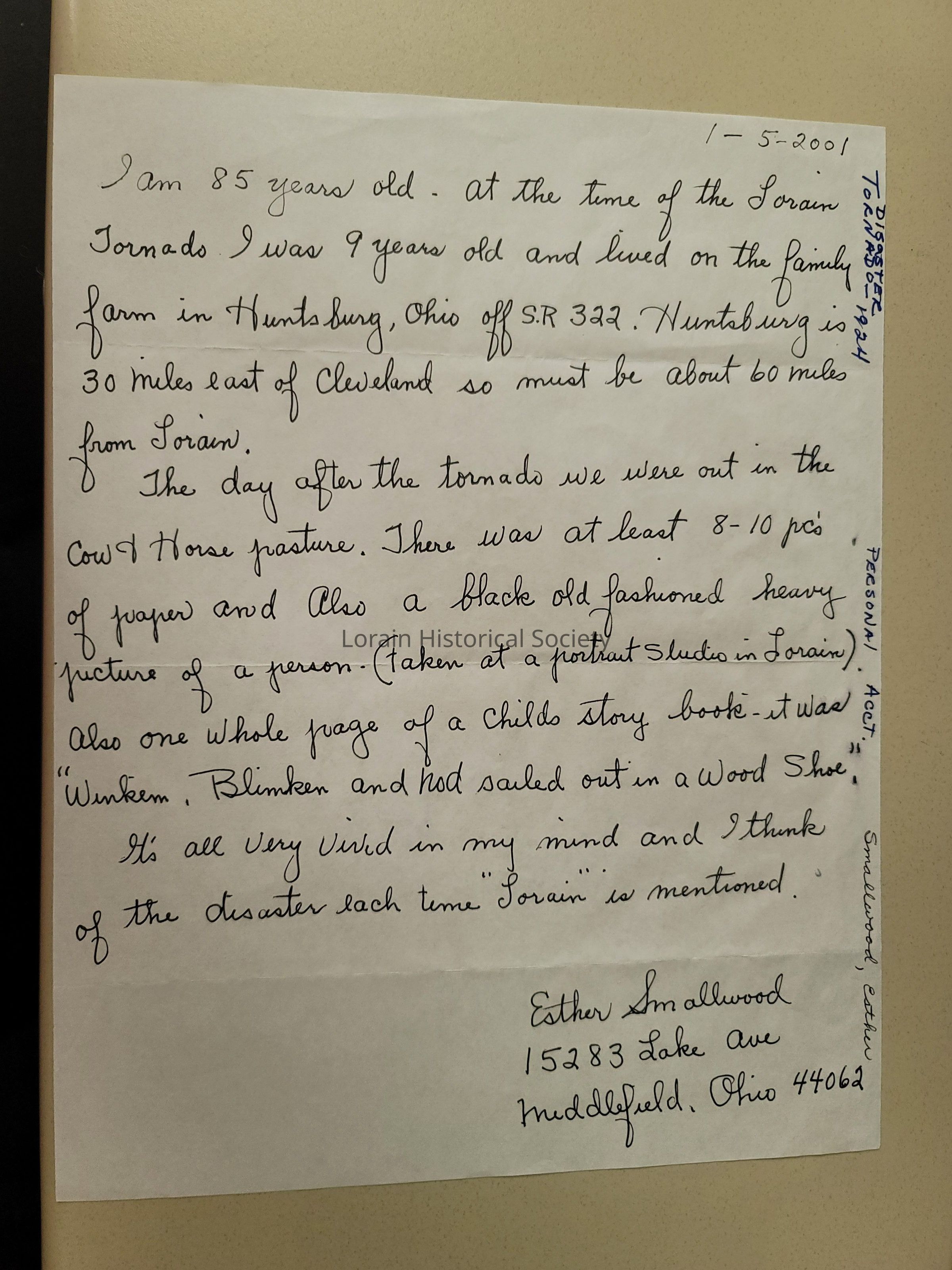 Esther was 9 years old at the time of the tornado and lived in Huntsburg, Ohio and recalls finding debris from the tornado that had blown 30 miles from Lorain into their cow and horse pasture.Acquisition