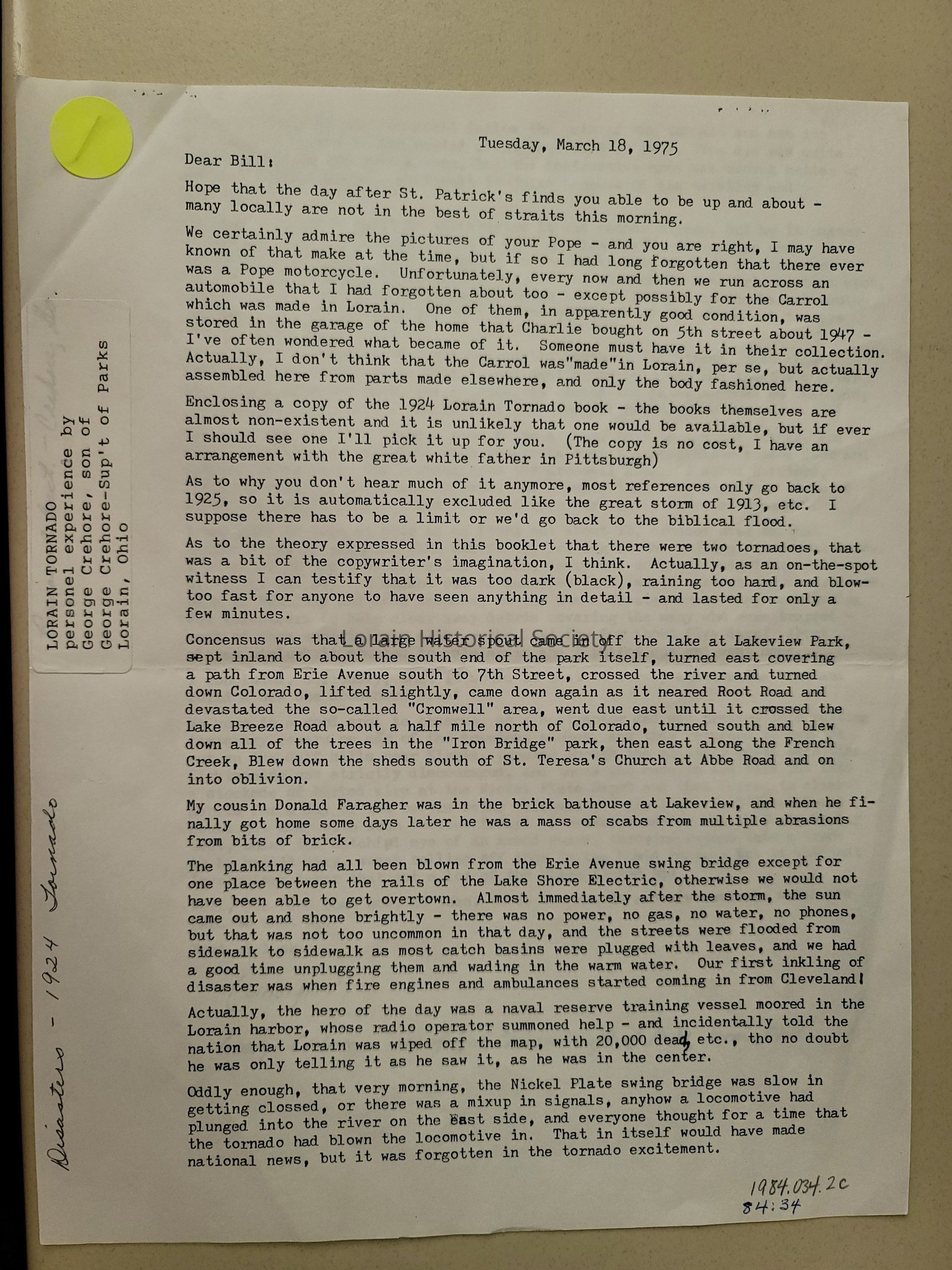 Tornado Account sent in letter from George Crehore addressed to "Bill."Context
