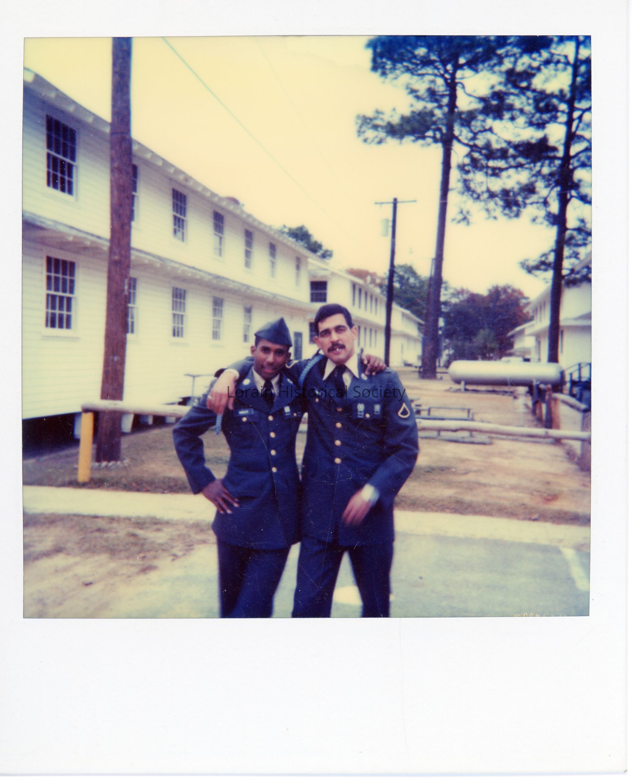 Photo of Mike Ferrer (right) standing with a fellow soldier after completing advanced individual training at Fort Campbell in Kentucky in November 1980. The men are wearing their dress uniforms and standing outside of the barracks. Mike served in the U.S. Army between 1980 and 1985 and was a member of the Commander-in-Chief's Guard, which was a special ceremonial unit.Collection