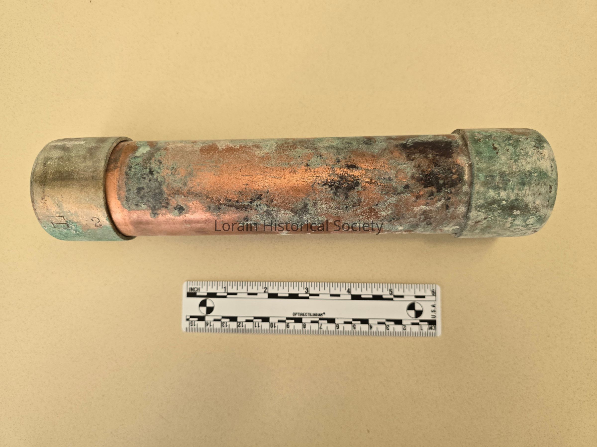 Time capsule container copper tube sealed with two end caps which was removed from the United Polish Club building July 23, 2024 the day the building was demolished. The tube was found inside a carved hole inside the datestone.