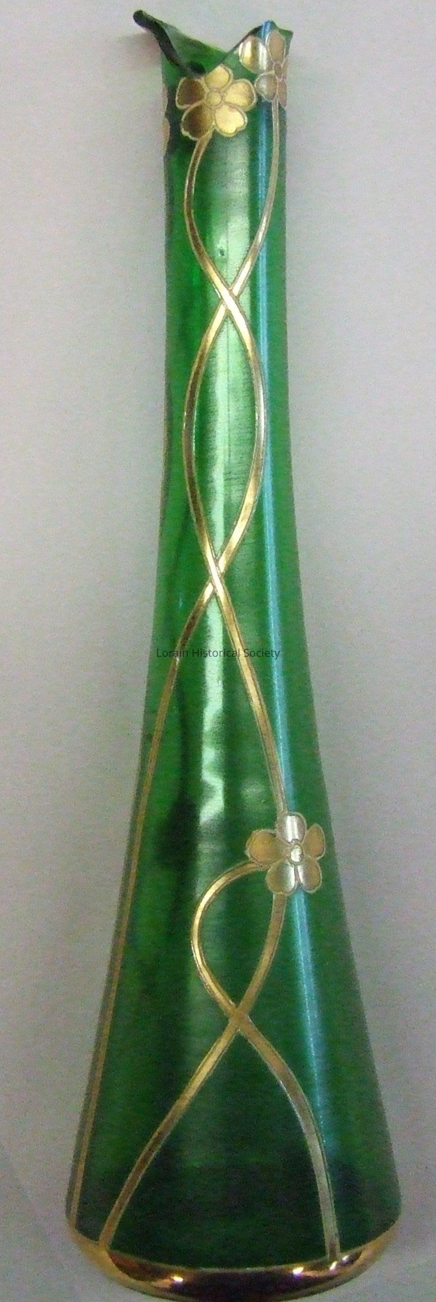 Green bud vase w/gold vine and white flowers survived Lorain Tornado 6/28/24. Vase was on top of piano in home of Michael & Margaret Murray, 1328 W. Erie Ave.Acquisition