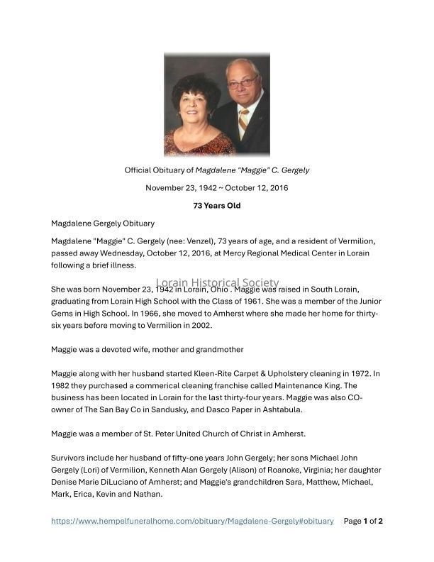 Magdalene "Maggie" (Venzel) Gergely obituary, Lorain High Class of 1961ACollection
