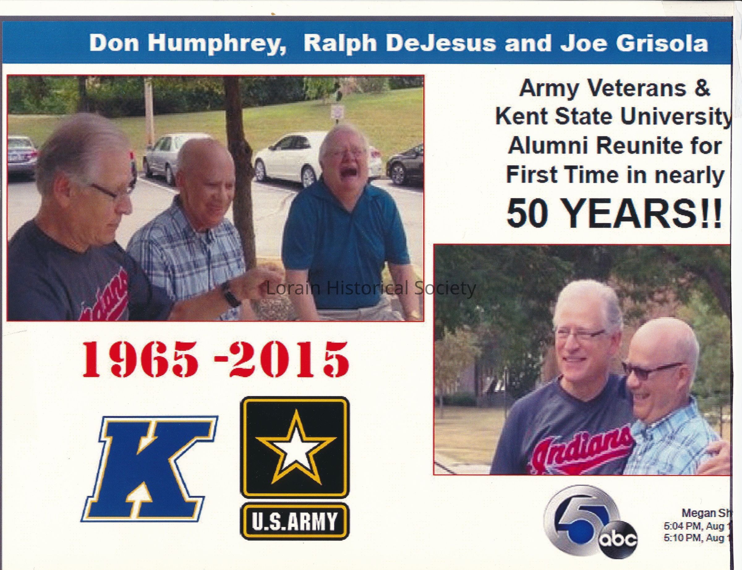 Memorabilia of a reunion that took place in 2015 at Kent State University in Kent, Ohio. The photo on the top left of the page shows Don Humphrey (left), Ralph DeJesus (middle), and Joe Grisola (right). The three men hadn't seen each other for 50 years before 2015. Mr. Humphrey, Mr. DeJesus, and Mr. Grisola attended Kent State University and served in the U.S. Army during the Vietnam War. They participated in an interview together during their reunion at Kent State.Collection