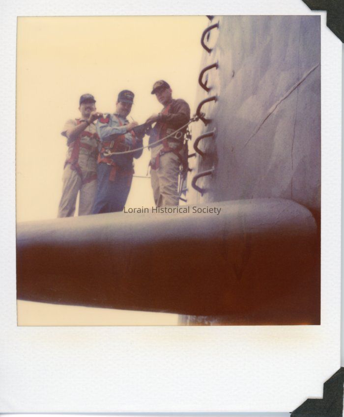Polaroid photo of Victor Ortiz standing between his division officer and division chief. Vic is receiving his reenlistment/promotion papers to the E-5 rank while tethered to the side of the submarine on March 10, 1992. They are on the sail of the submarine USS Francis Scott Key SSBN 656 in Kings Bay, Georgia. Vic served in the U.S. Navy.Collection