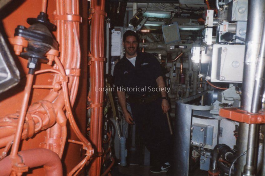 Photo of Victor Ortiz in his "poopy suit" (a jumper) on the submarine USS Michigan SSBN 727 between 1993 and 1995. The "poopy suit" could be used as a floatation device. The orange tubes housed missiles. Vic, standing watch as Nuclear Weapons Security, is leaning due to the submersion of the submarine. Vic served in the U.S. Navy.Collection
