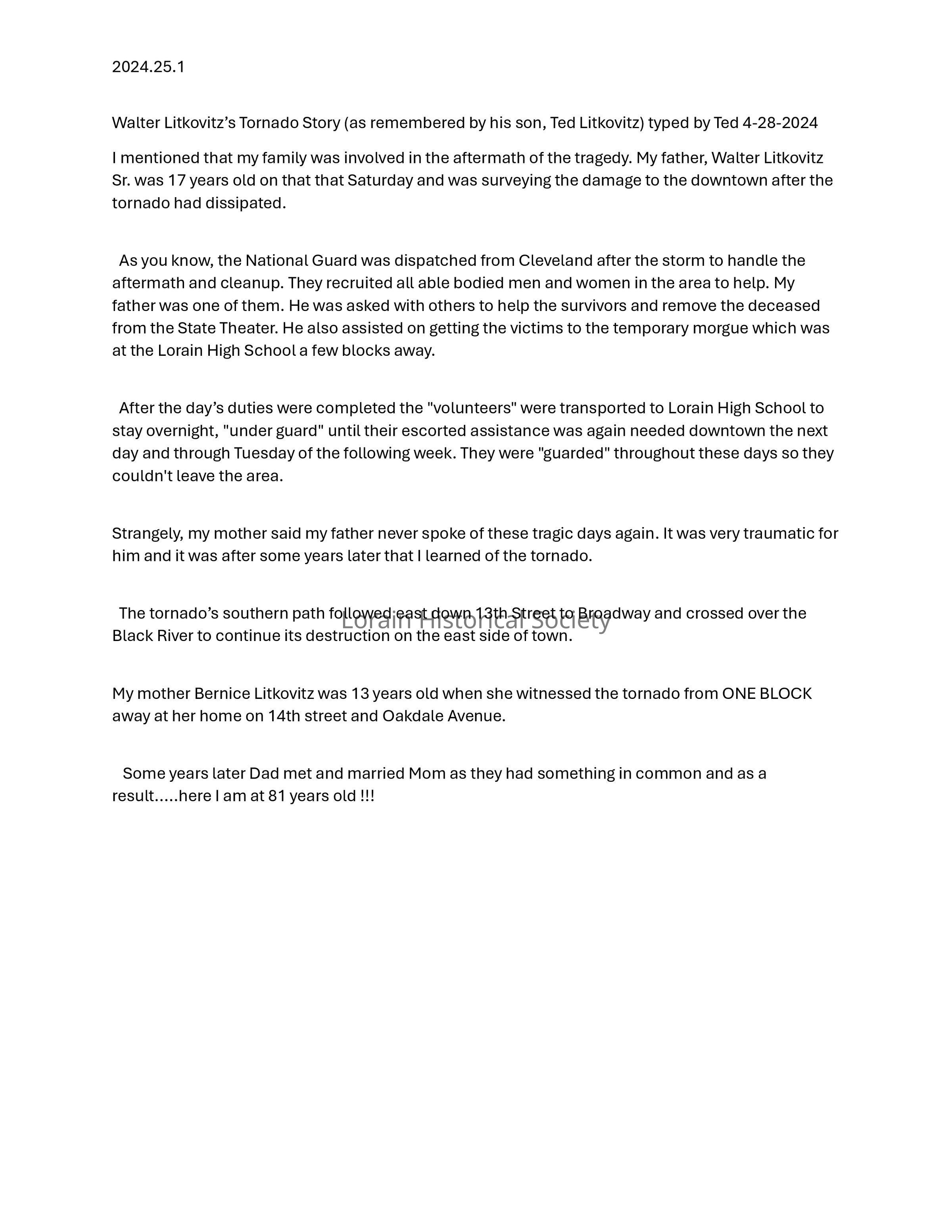 Walter Litkovitz's account of his experience during the Lorain Tornado in 1924, as remembered by his son Ted Litkovitz.Acquisition