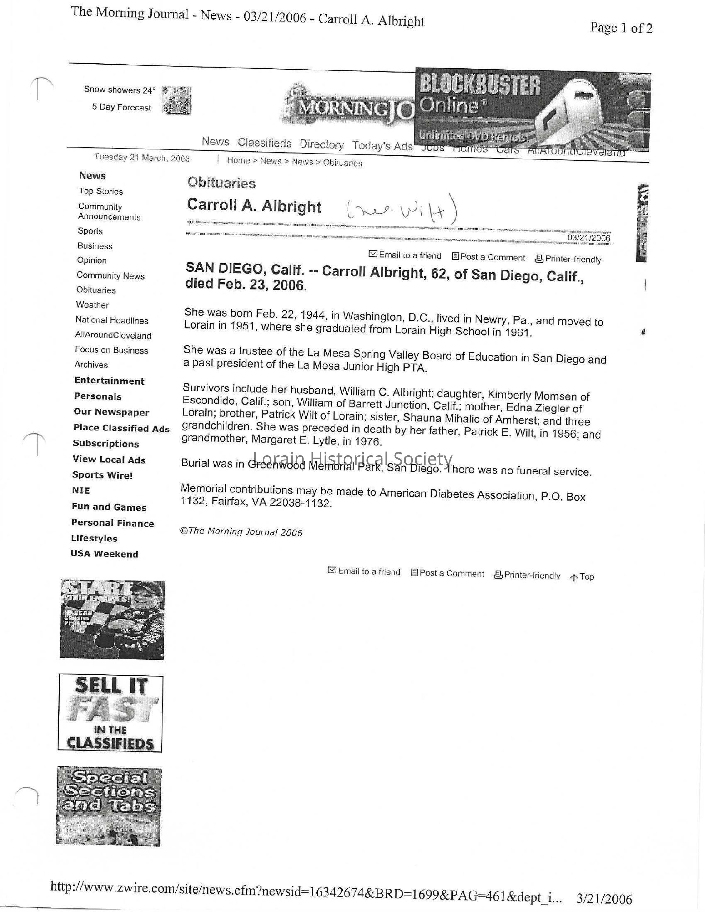 Wright, Carroll A. Albright obit