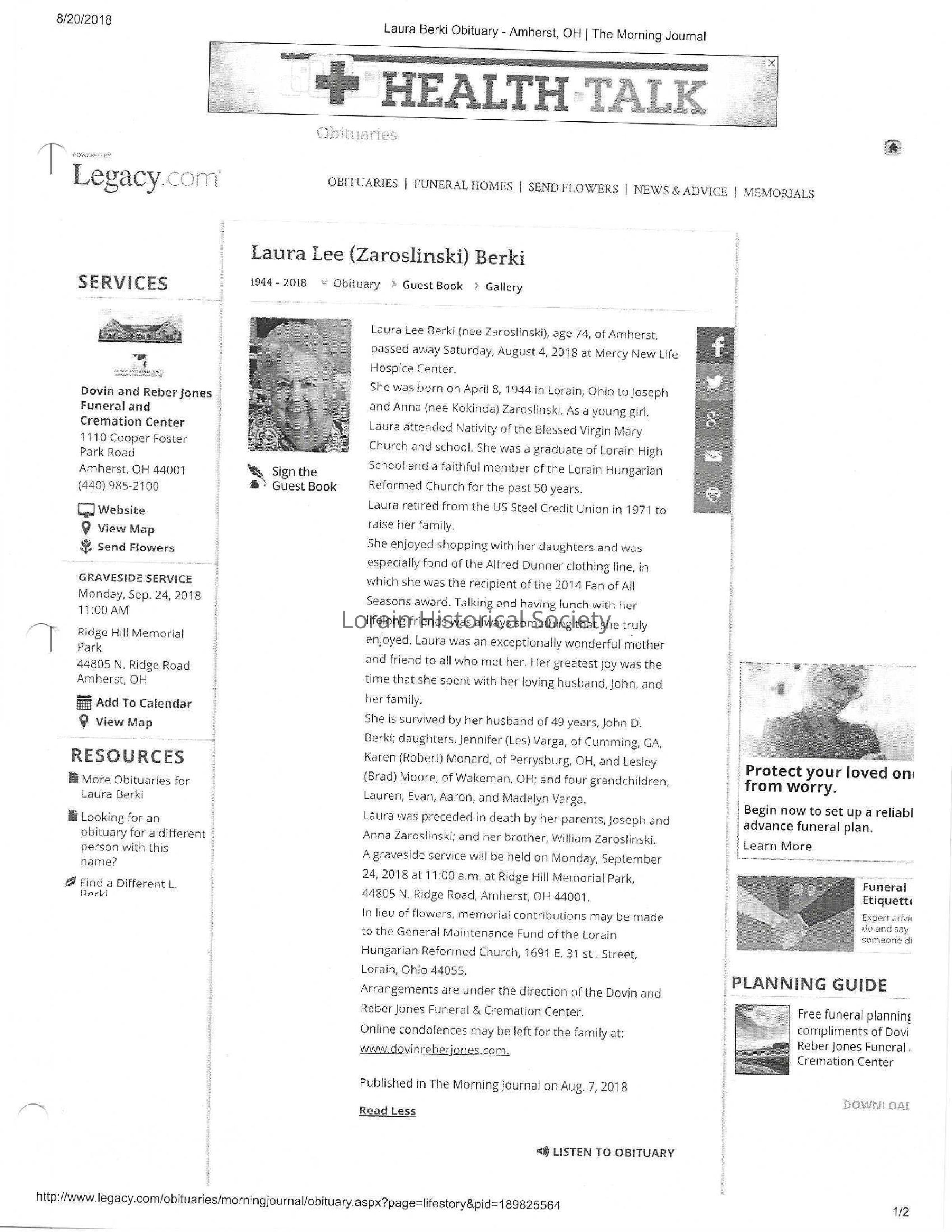 Zaroslinski, Laura Lee Berki obit