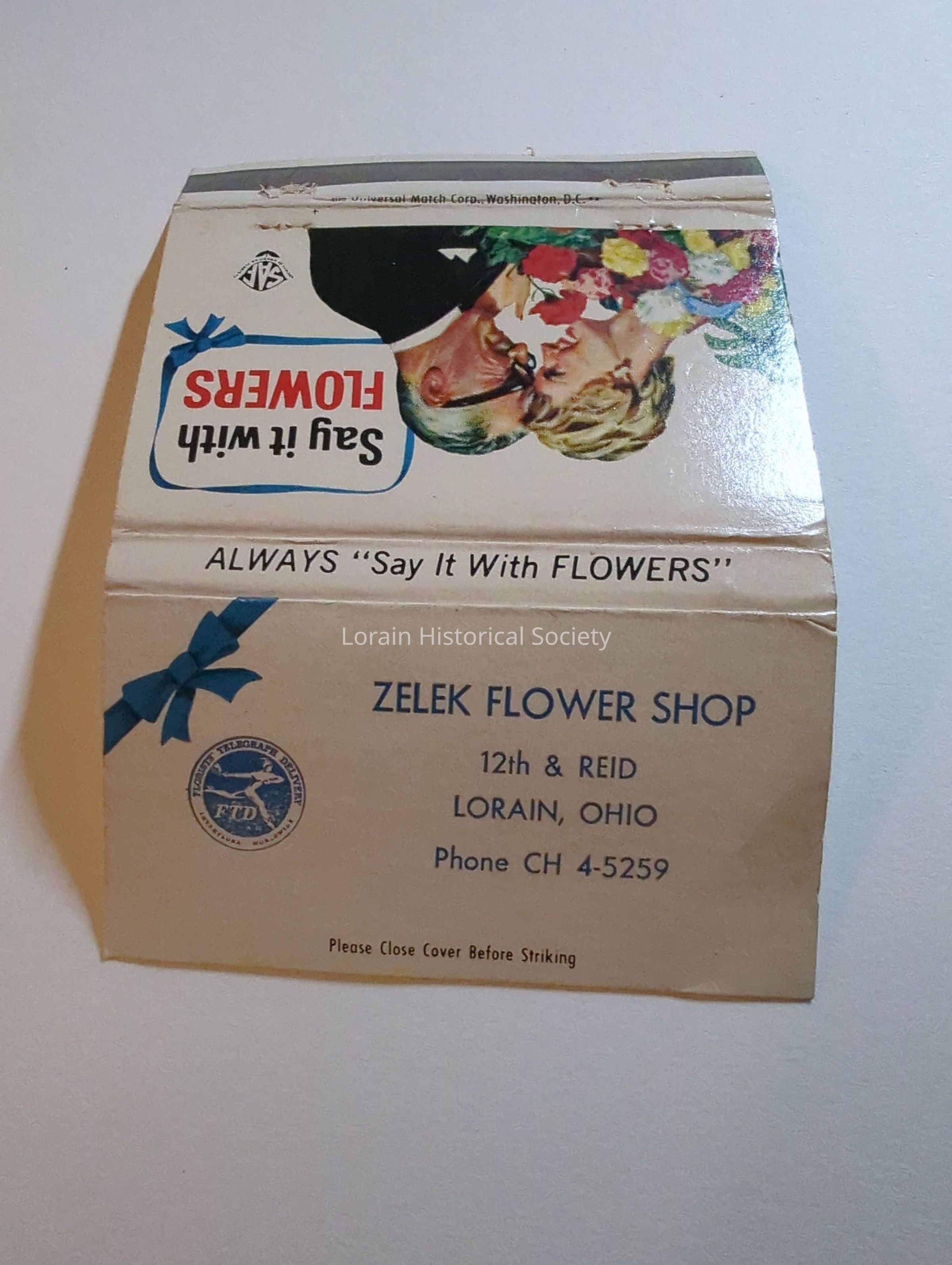 A double wide matchbook with advertising from Zelek Flower Shop. Ad on matchbook includes the FTD slogan "Say it with Flowers".Acquisition