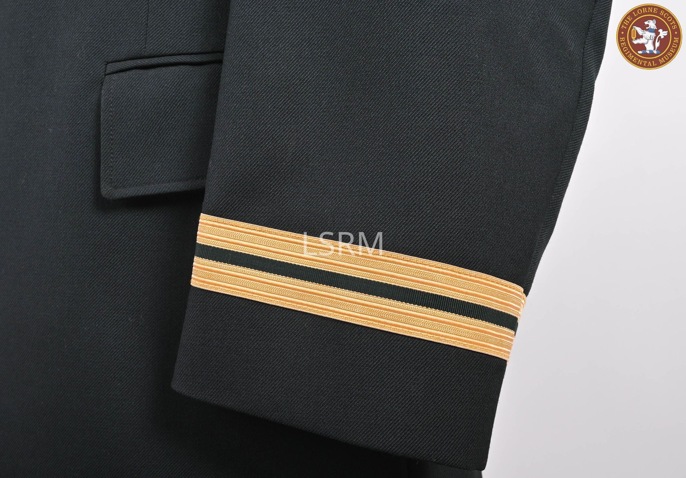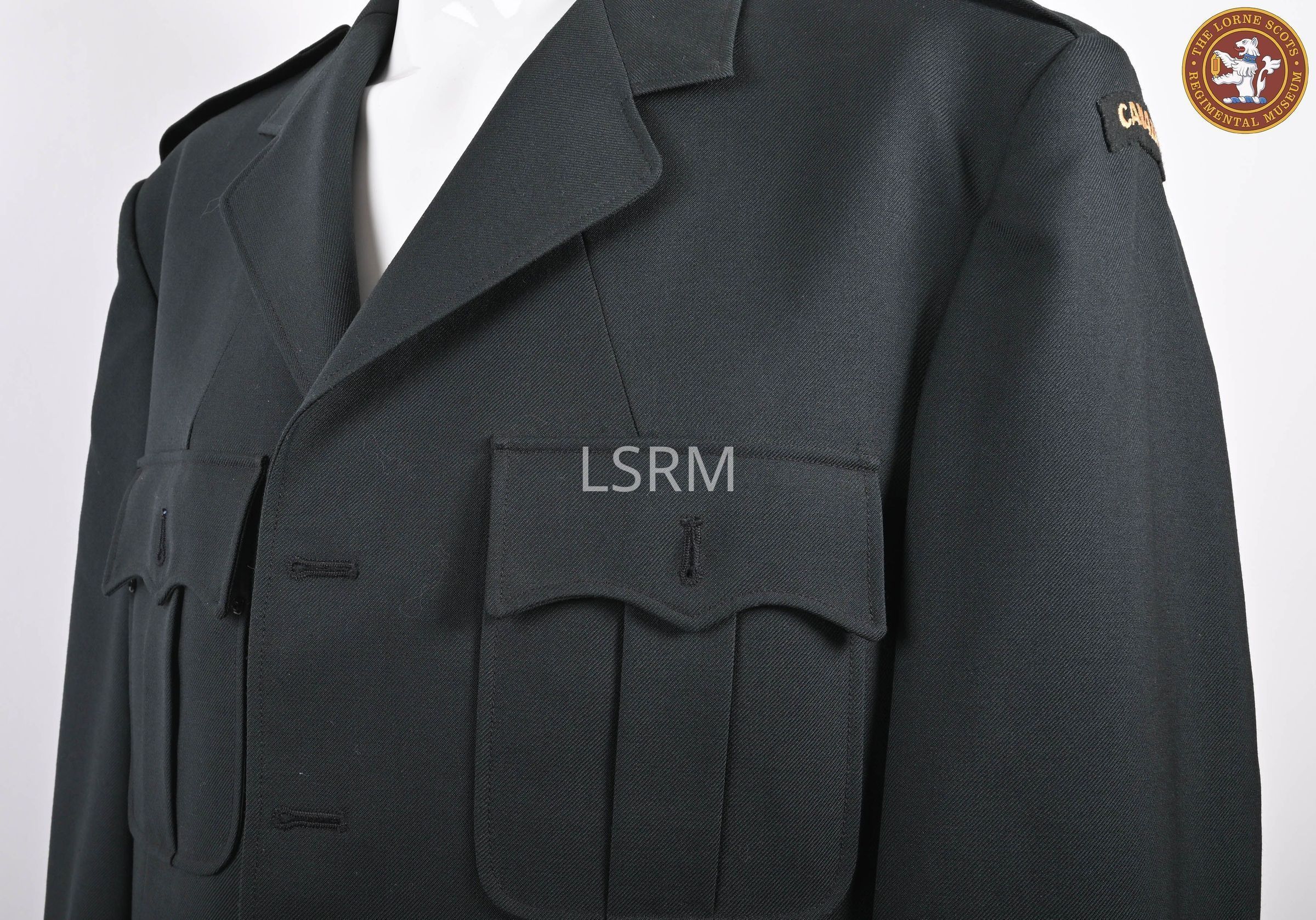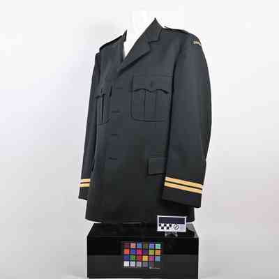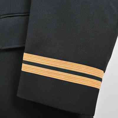 A green Canadian Armed Forces (CAF) Service Dress Jacket with CANADA shoulder flashes. Captain rank braid on cuffs. No buttons.Use