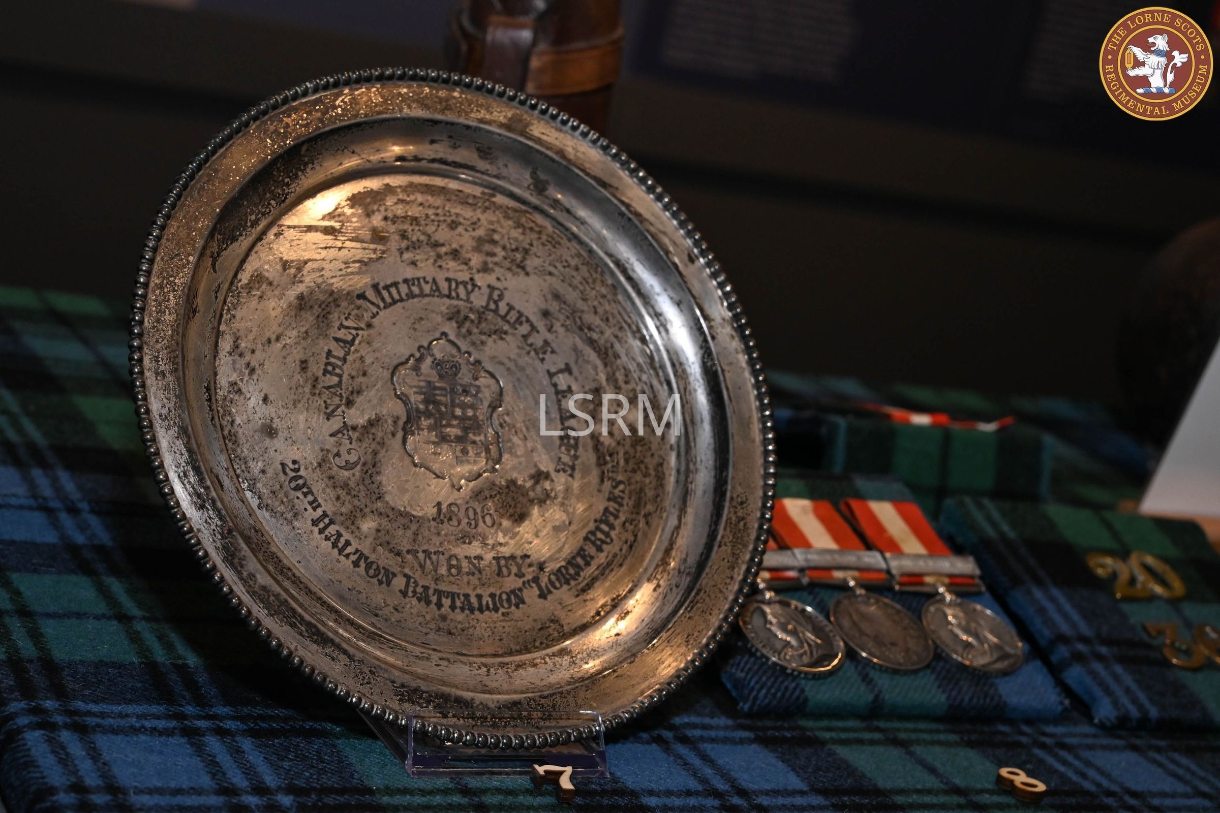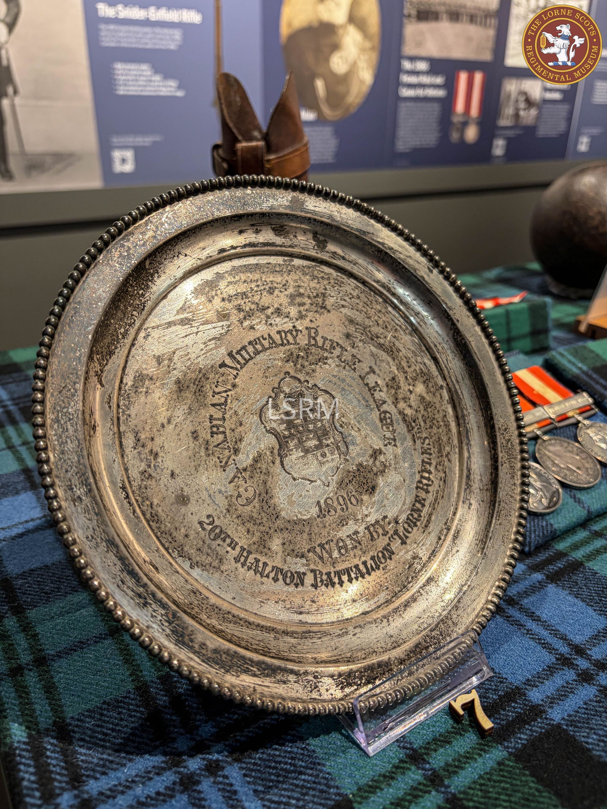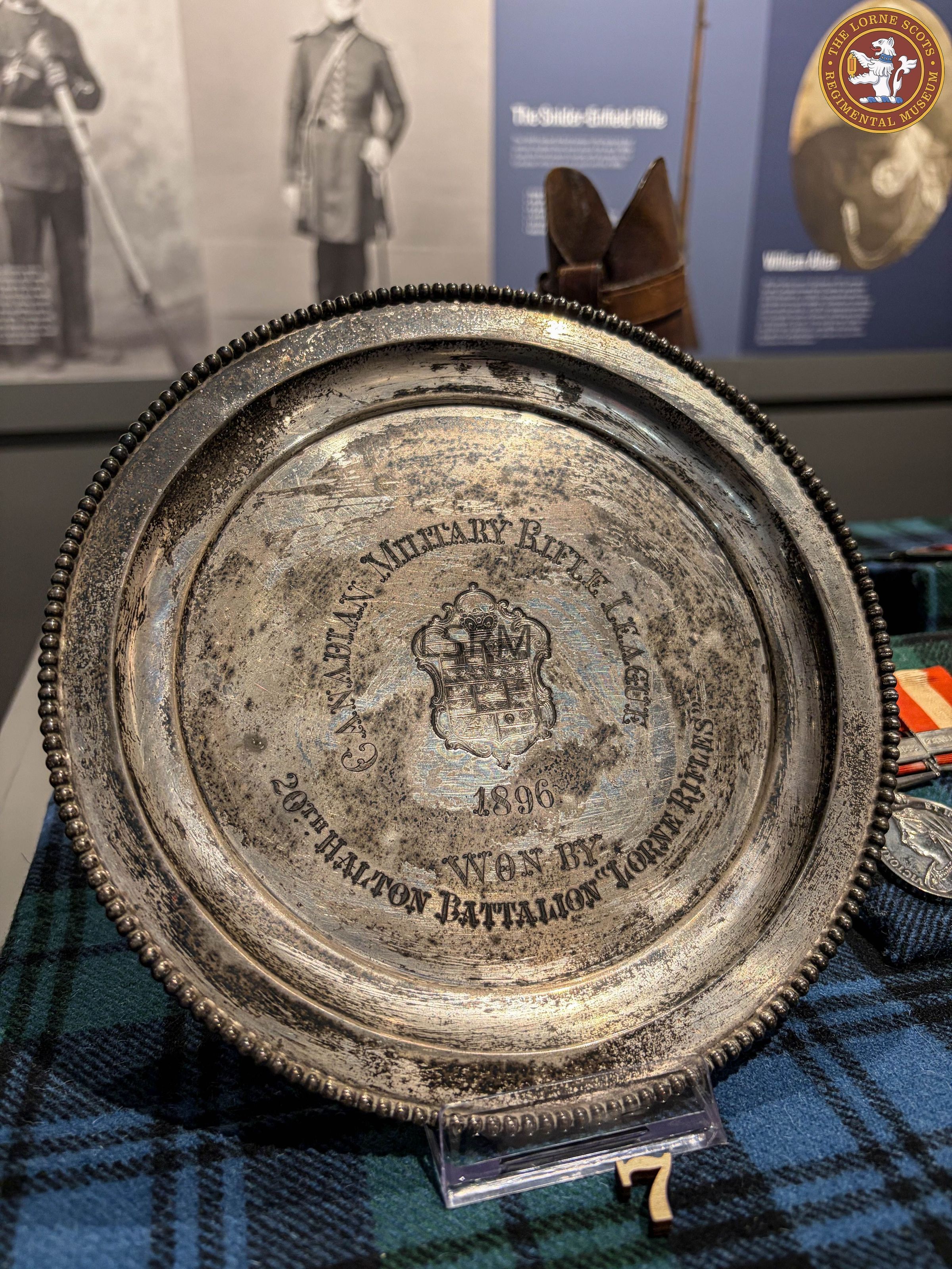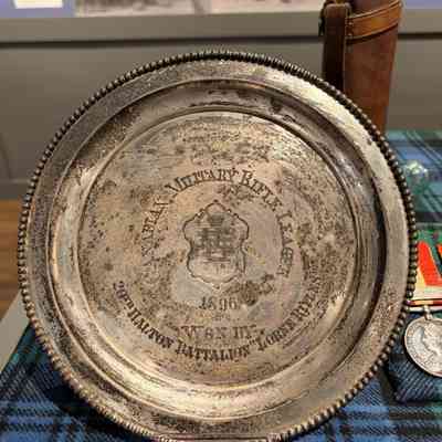 Silver plate awarded as a prize by the Canadian Military Rifle League for shooting competition in1896. Won by the 20th Halton Battalion, Lorne Rifles.Context