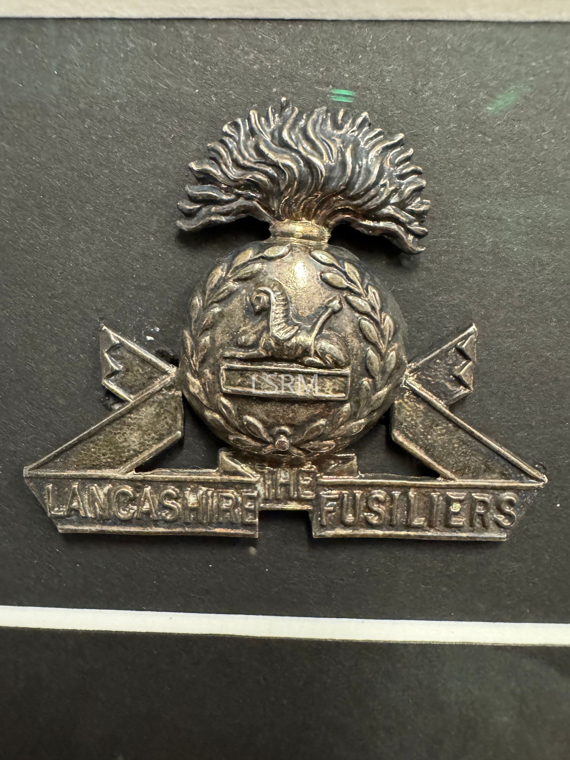 In 1929, LCol CM Corkett championed the alliance between the Lancashire Fusiliers and the Peel and Dufferin Regiment. He had served with the 2nd Battalion, Lancashire Fusiliers from 1915 until 1917. This cap badge is framed in the Corkett collection.