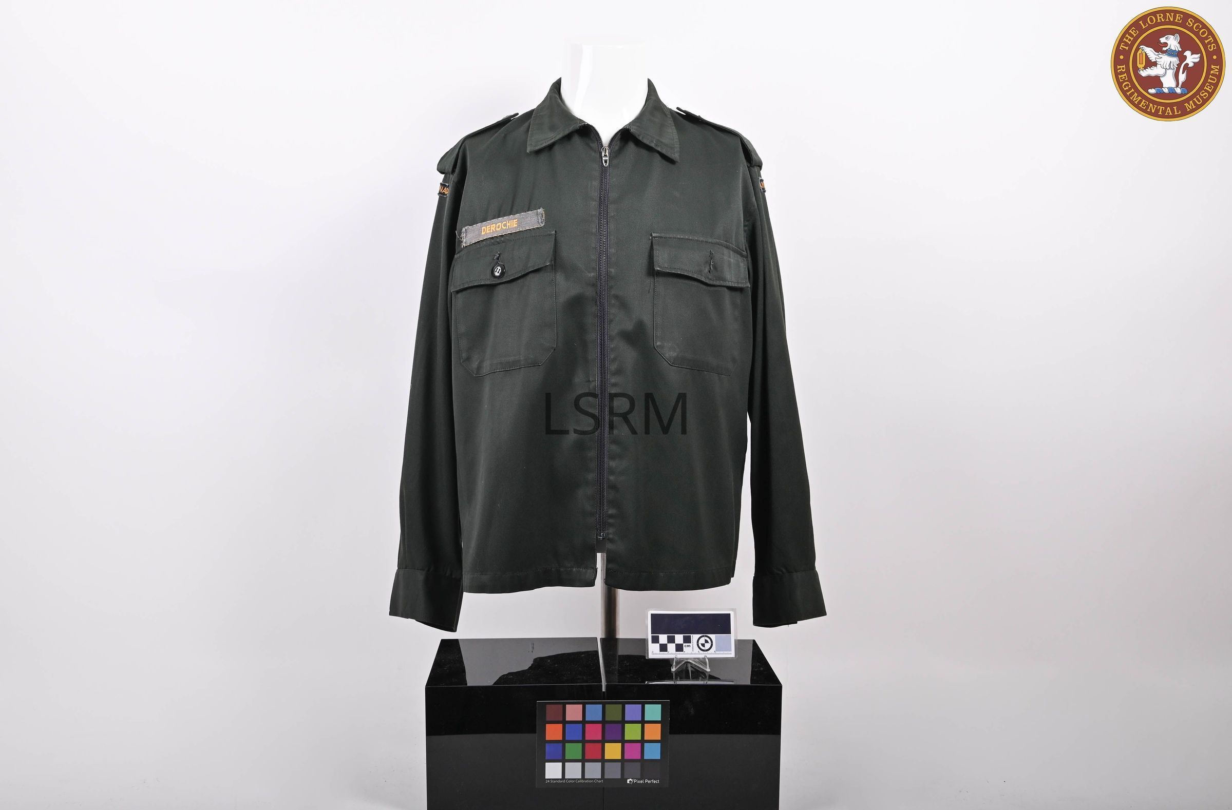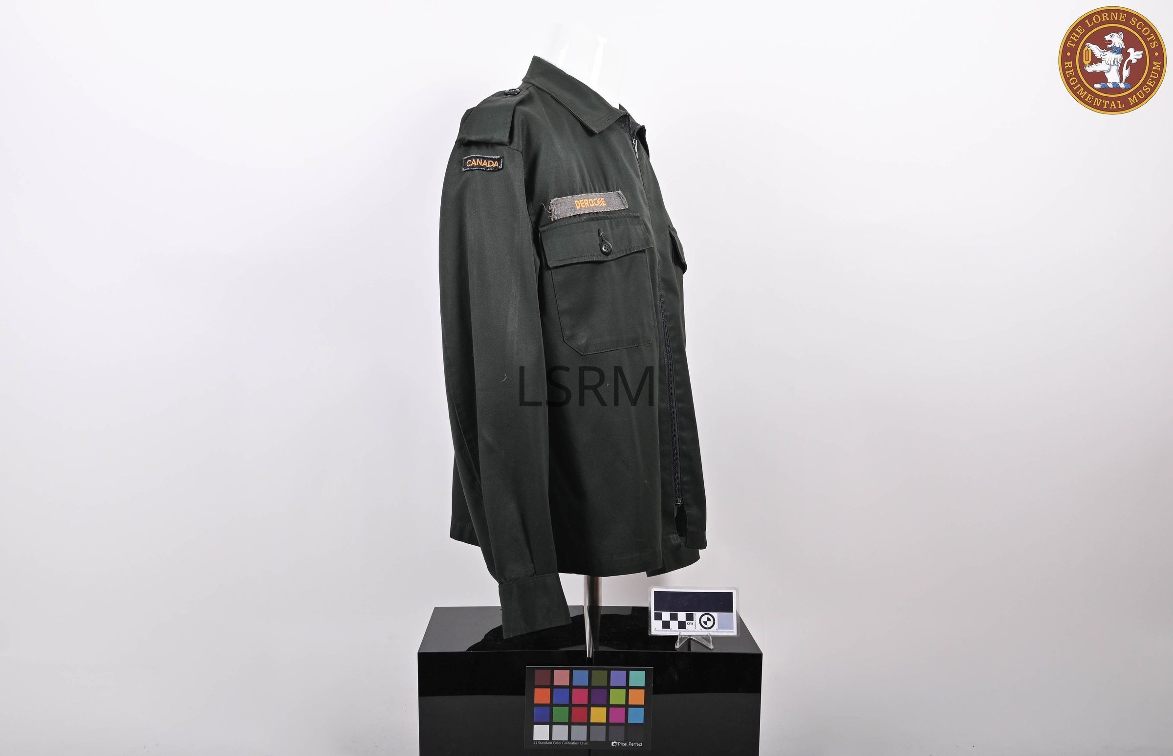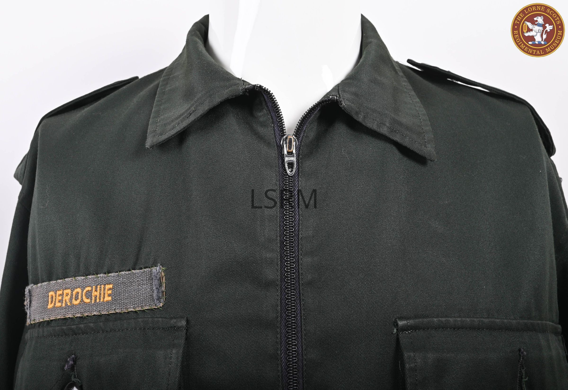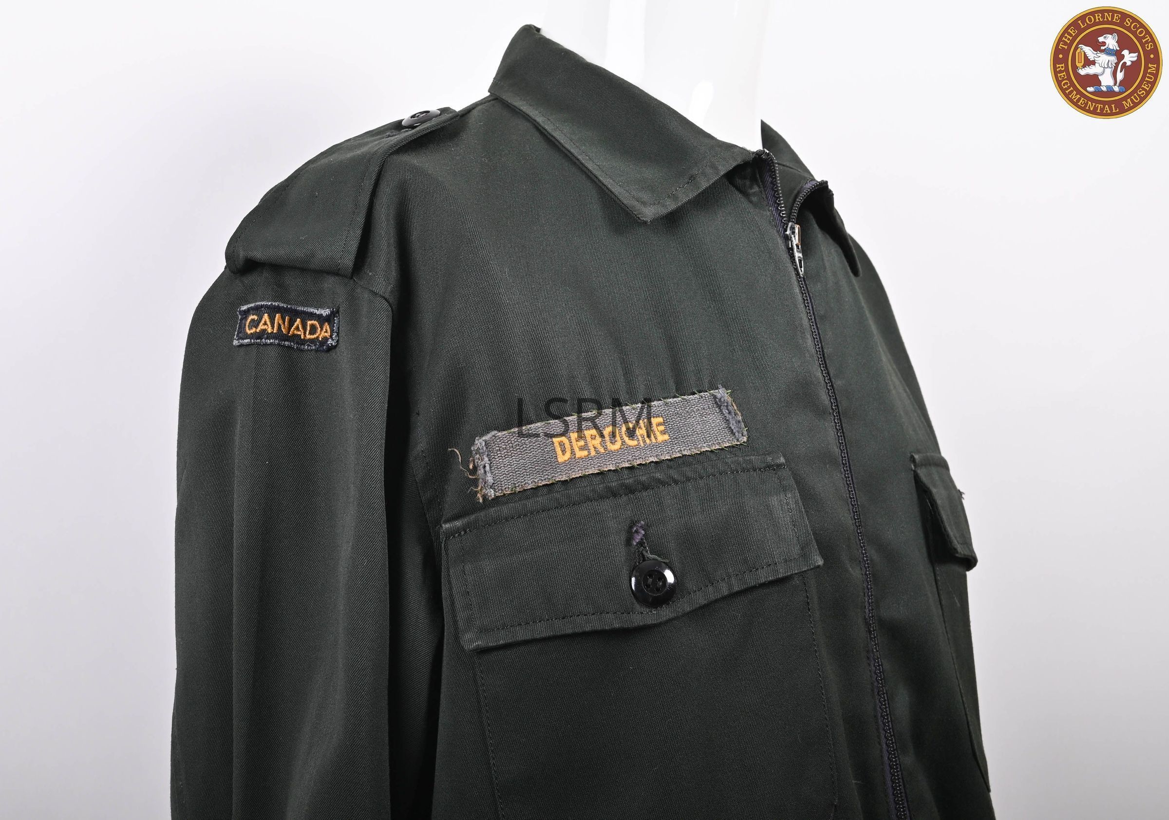 Name to DEROCHIE, Missing Button on left breast pocket. Derochie is Lieutenant Colonel J.EJ. Derochie who tranferred to the Lorne Scots from the Stormont, Dundas and Glengarry Highlanders in 1974. He commanded the Lorne Scots from 1985 to 1988.Made/Created