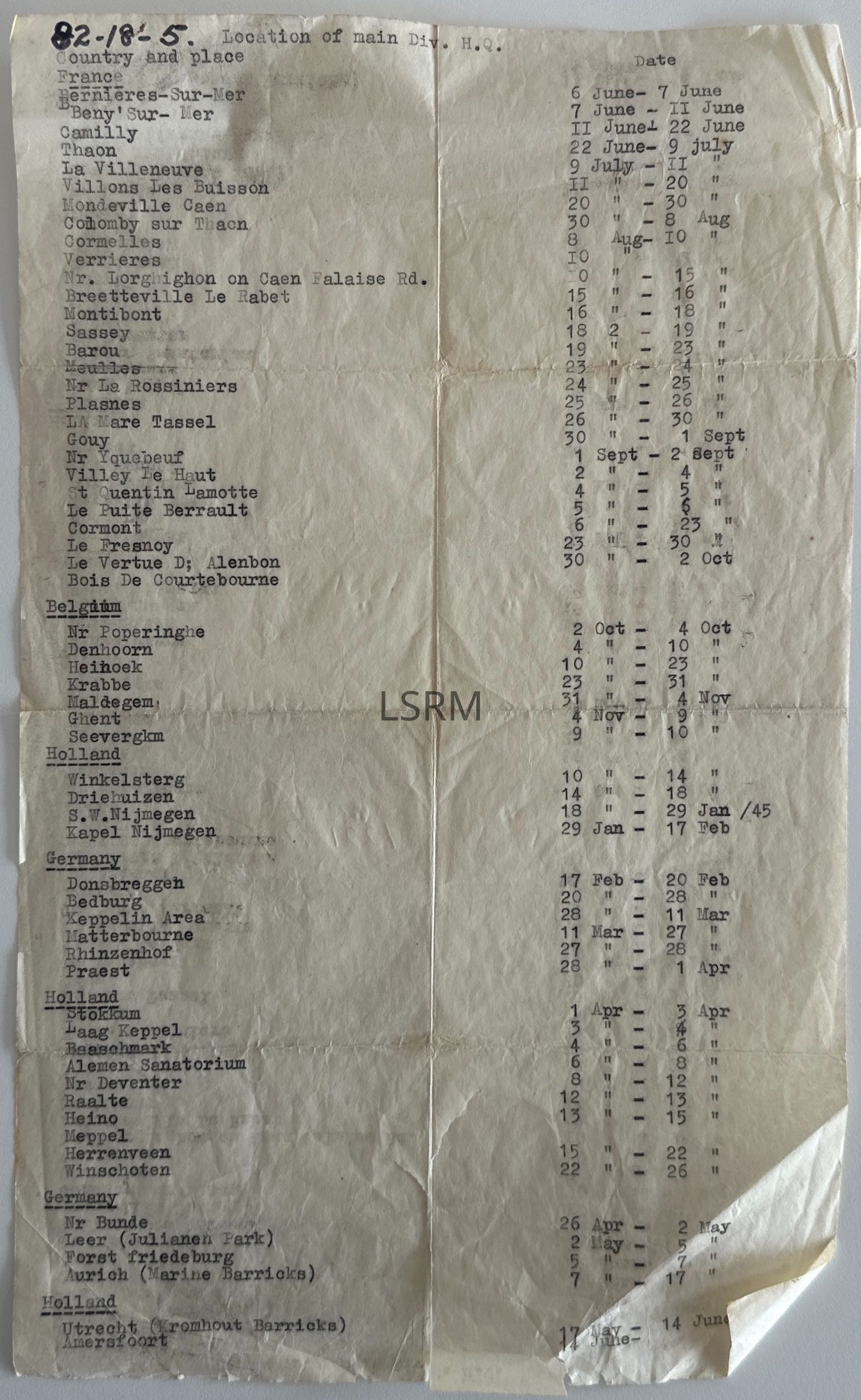 Document, Location of 3rd Canadian Division Main Headquarters June 1944 - June 1945Entry/Object ID