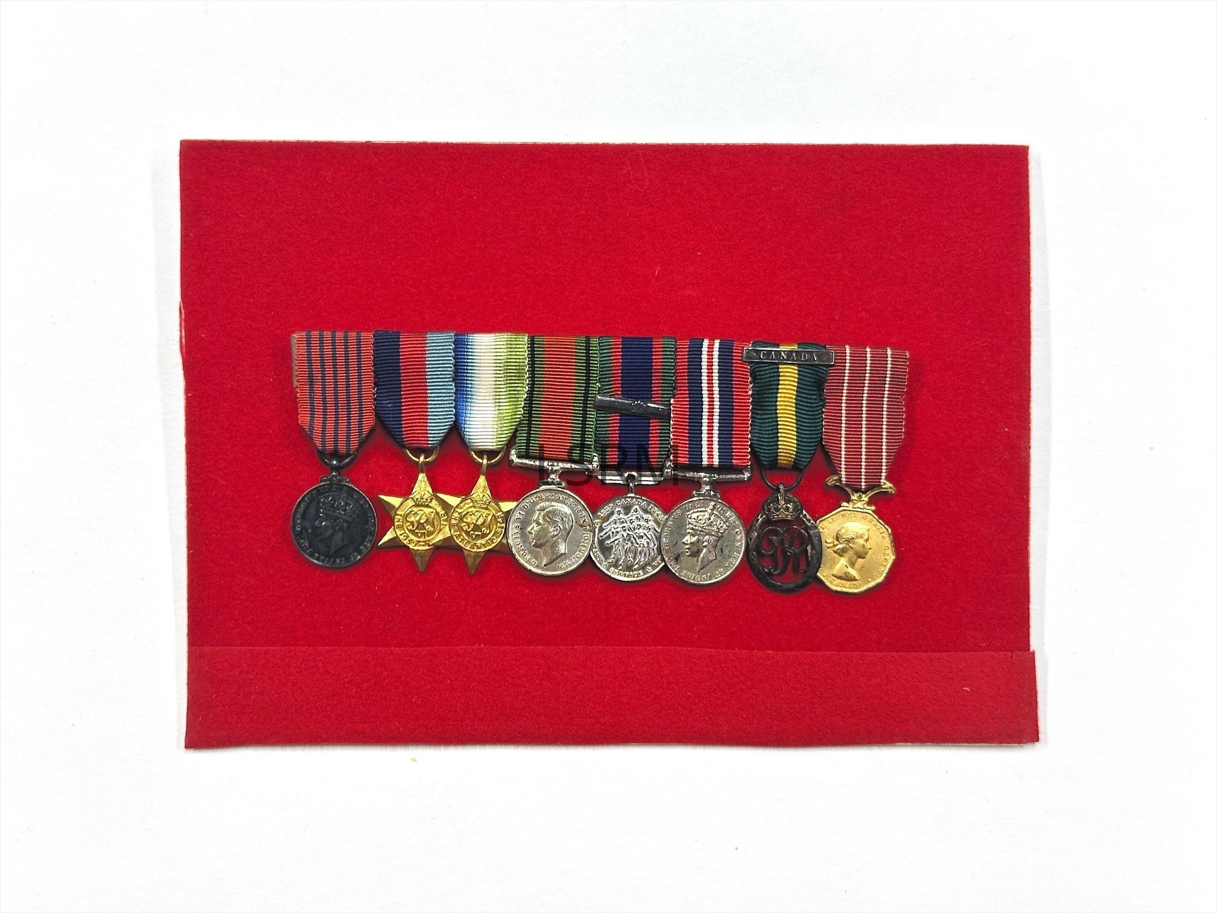 The 8 original miniature medals of Second World War veteran, Dr. David Colin Heggie (Lorne Scots). Medals include the George Medal, the 1939-1945 Star, the Atlantic Star, the British Defence Medal, the CVSM with overseas bar, the Efficiency Decoration, and the Canadian Forces Decoration (CD). The medals are mounted to a red backing for display, presumably by their original owner or by the early museum.Use