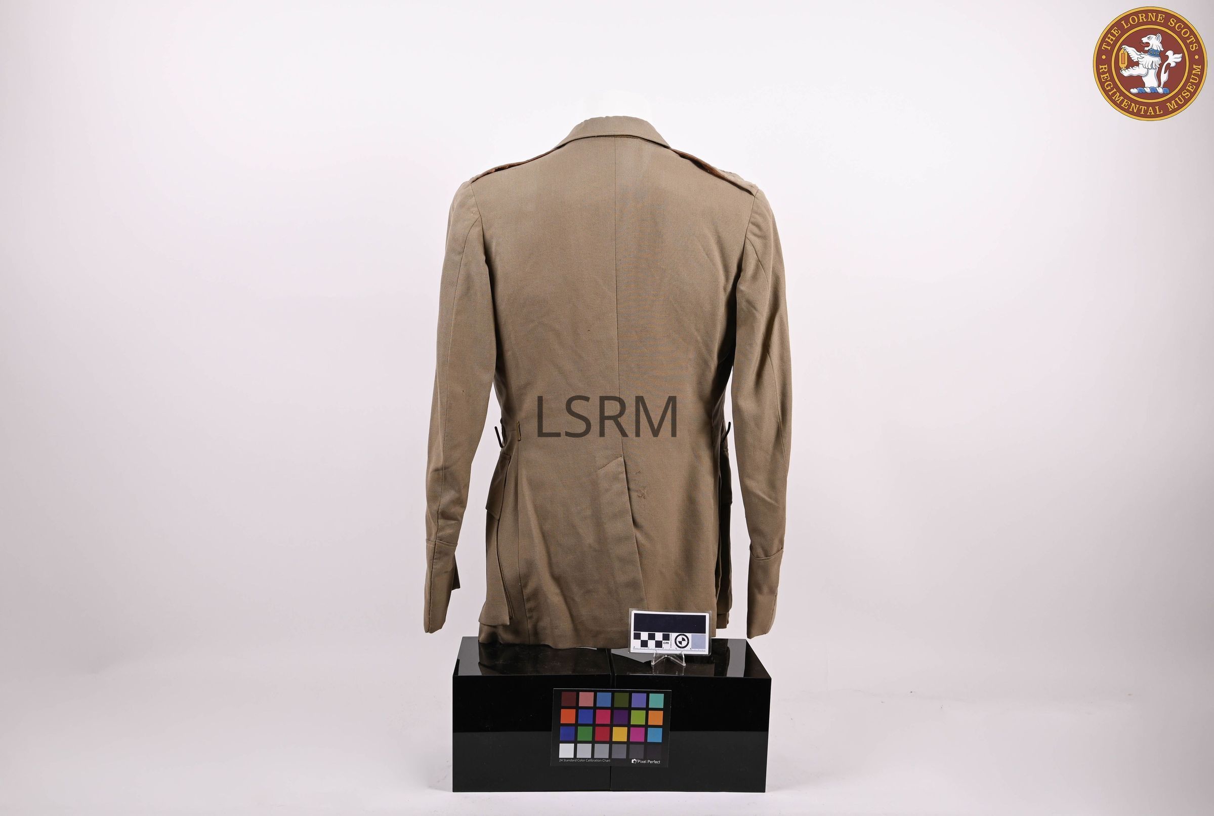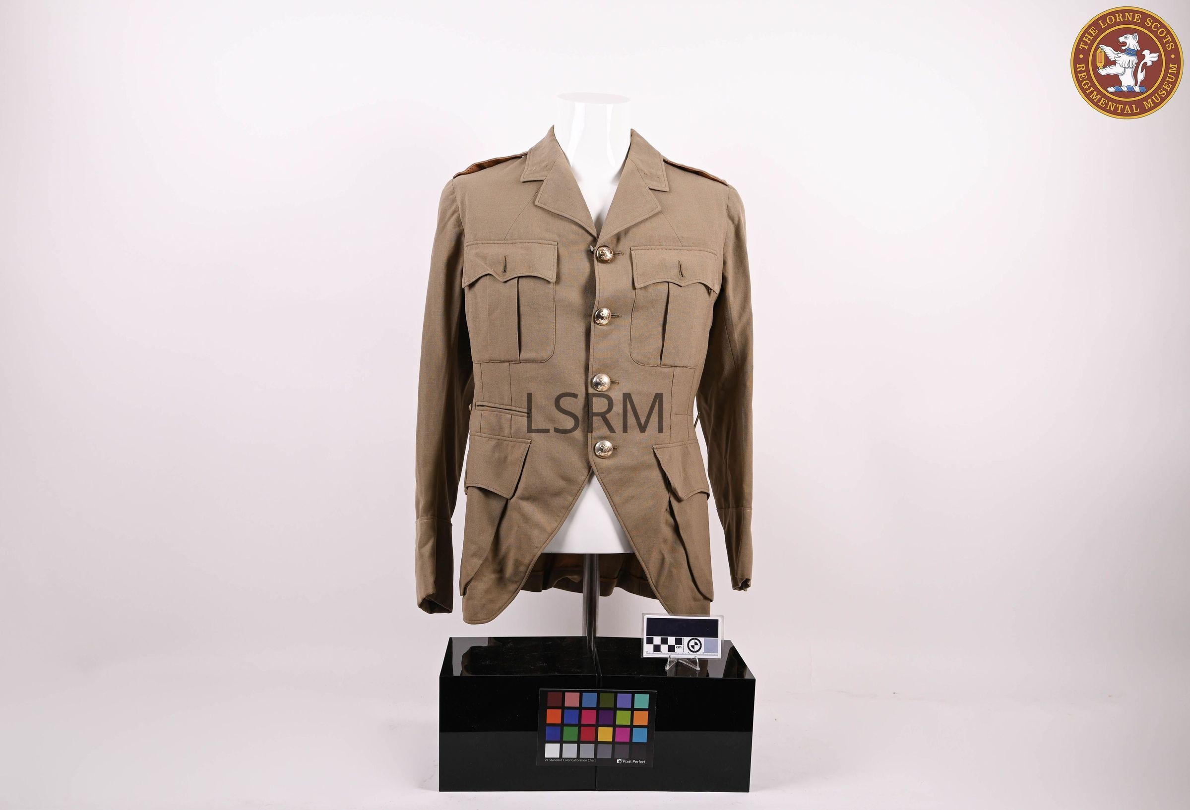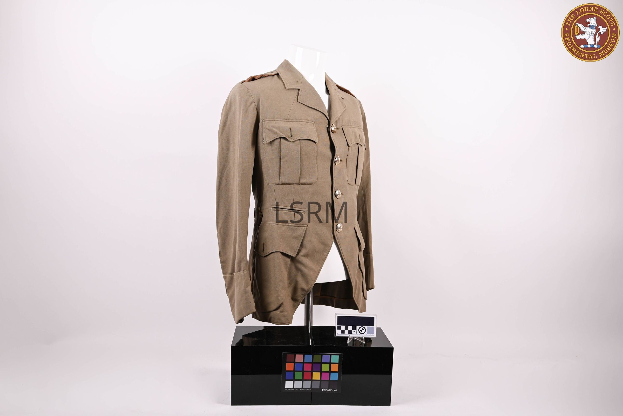 An officer's khaki service dress jacket, tropical worsted and highland cut. Named to E.F. Conover, with gold Lorne Scots demi-lion buttons.Use