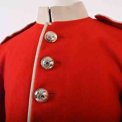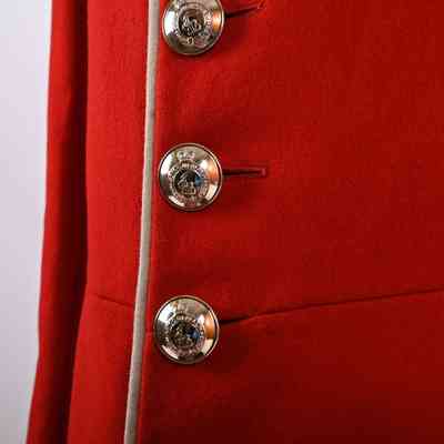 The red ceremonial dress jacket of the Lancashire Fusiliers. This jacket has a white standing collar and cuffs (facings), and silver Royal Warwickshire Regiment buttons.Use