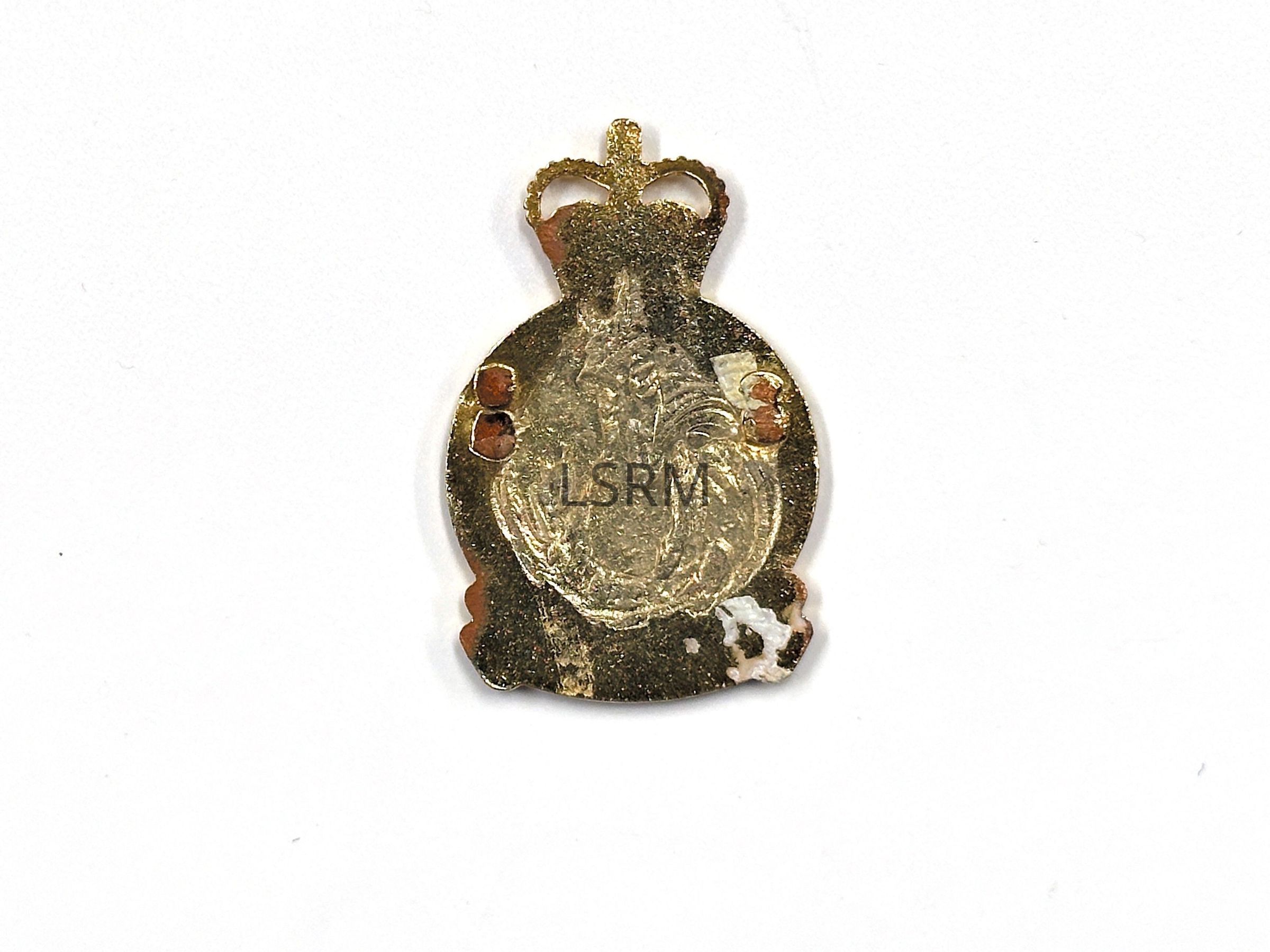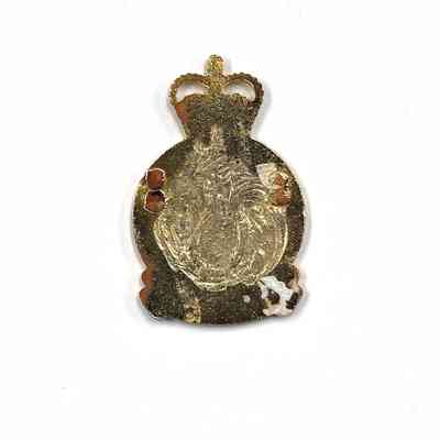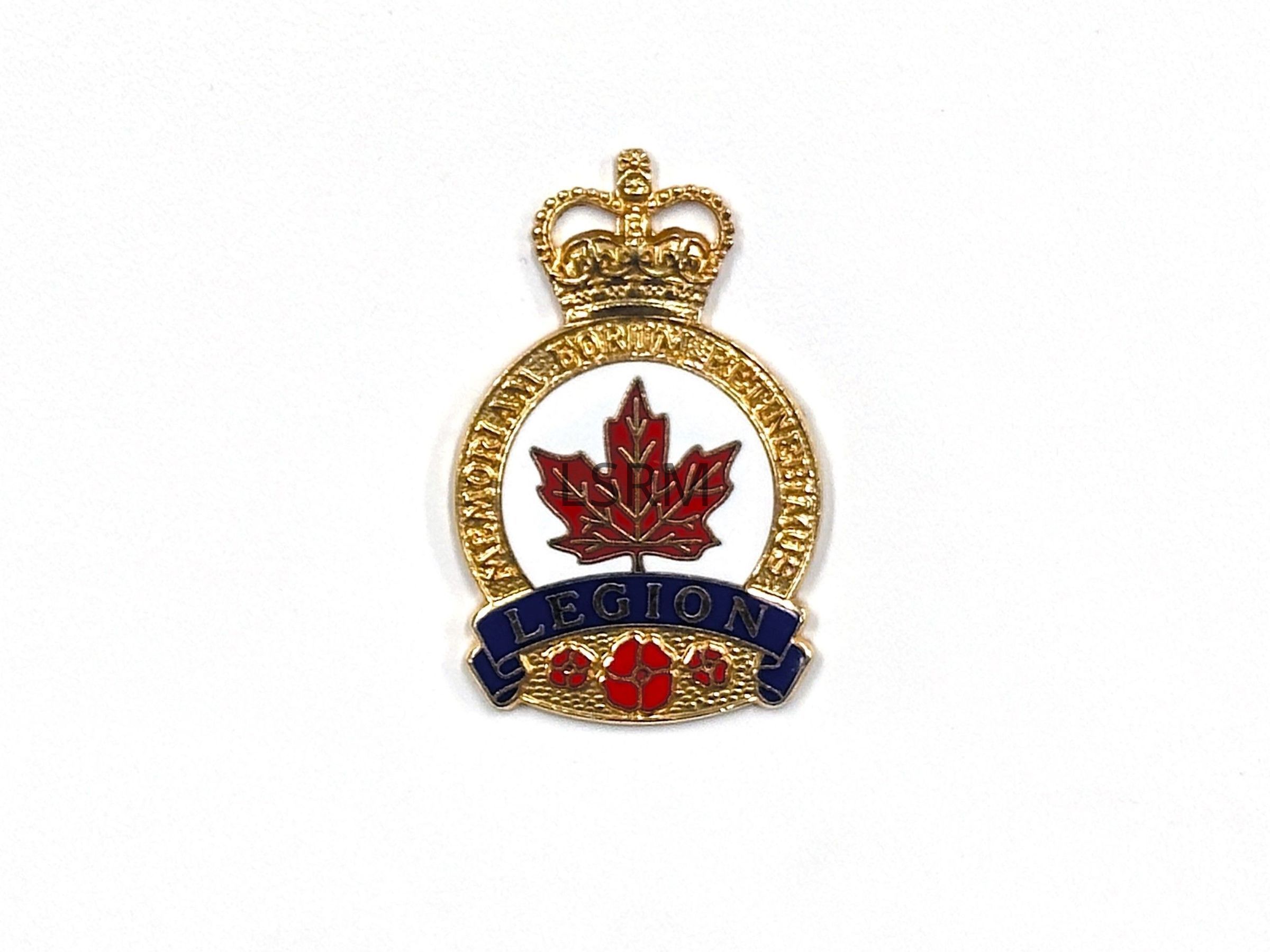 A gold, red, and blue coloured Royal Canadian Legion cap badge. The central maple leaf design is surrounded by a circlet containing the Latin words "MEMORIAM FORUM RETINEBIMUS" and surmounted by a crown (Queen Elizabeth II). The "Legion" identifier is joined by 3 decorative poppies.Use