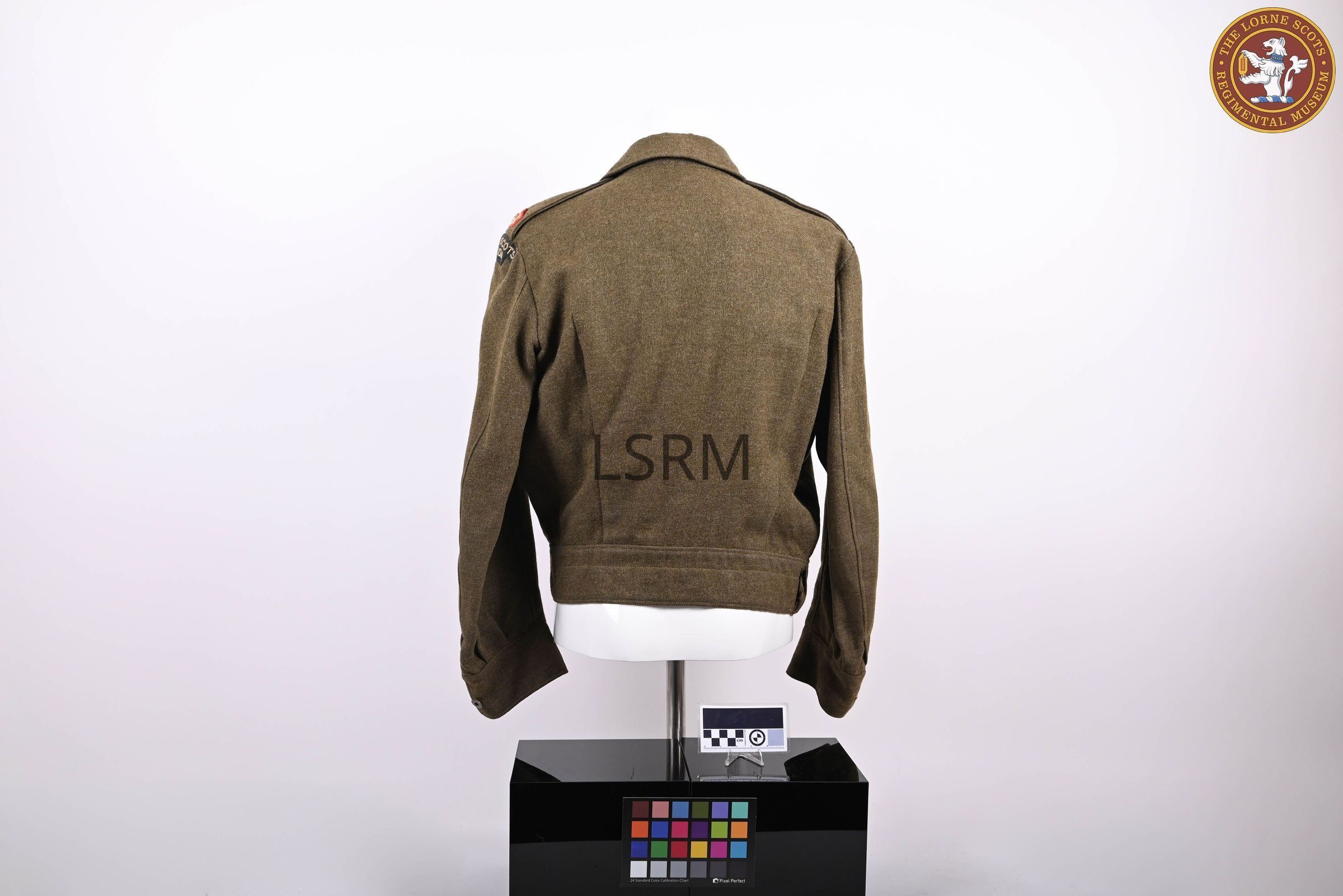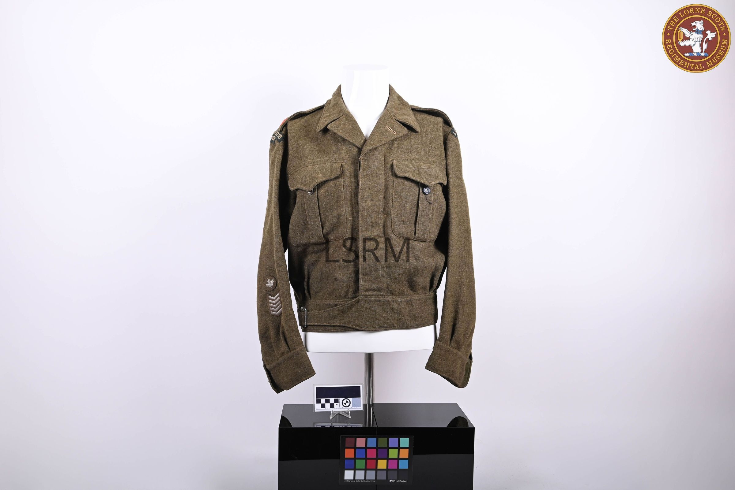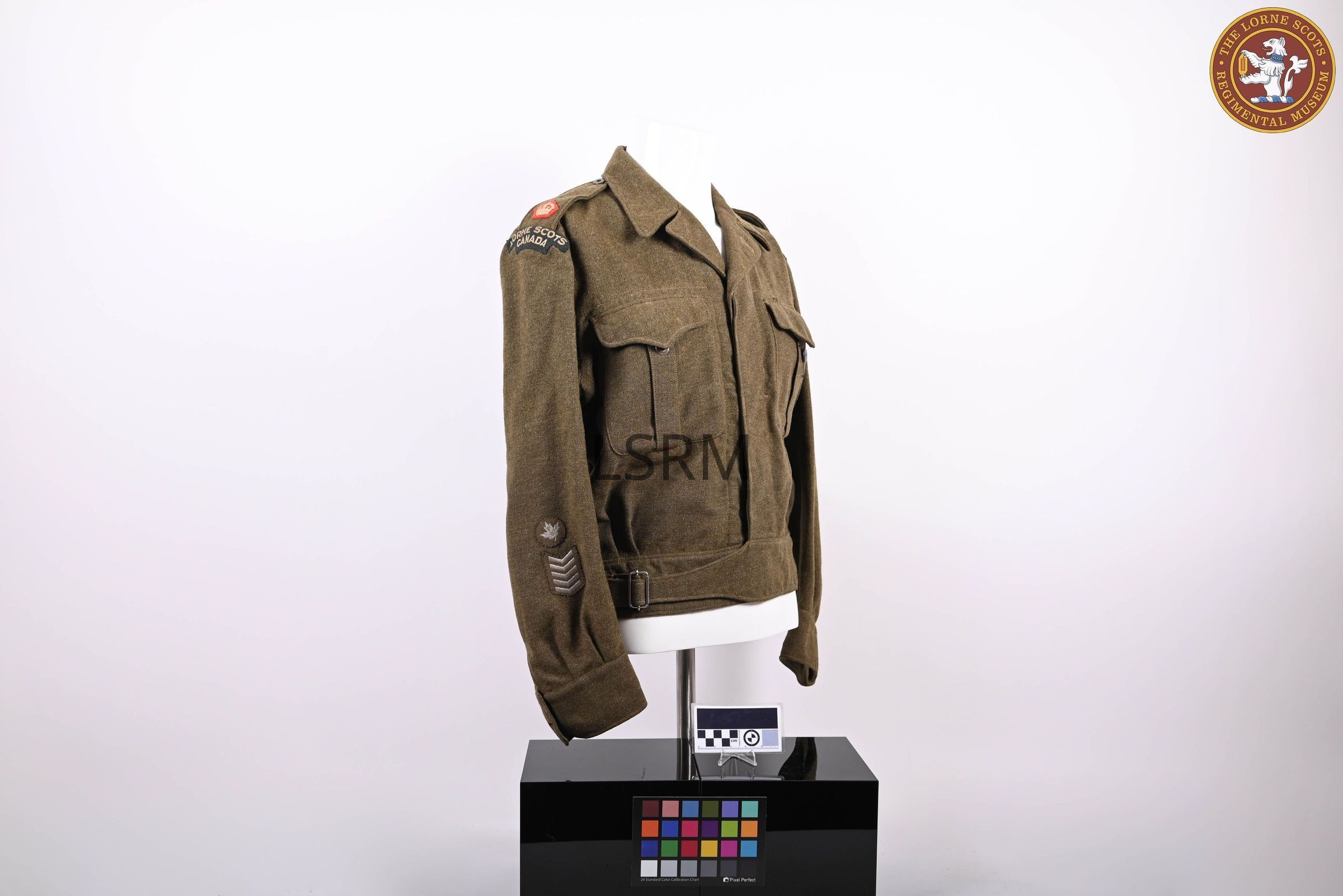 Battle dress blouse named to Major E.F. Conover, with Lorne Scots Regiment shoulder flashes (green ground and white letters), Major shoulder rank, and 5 silver service chevrons with a silver maple leaf.Use