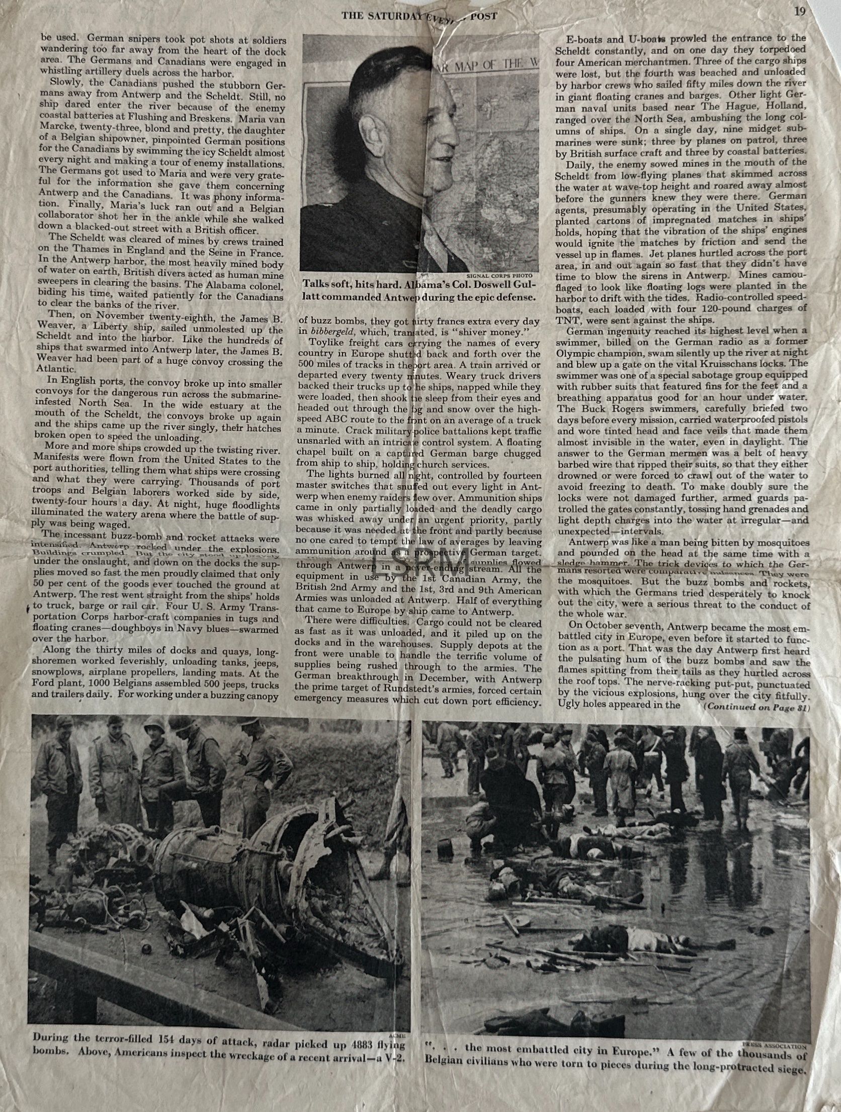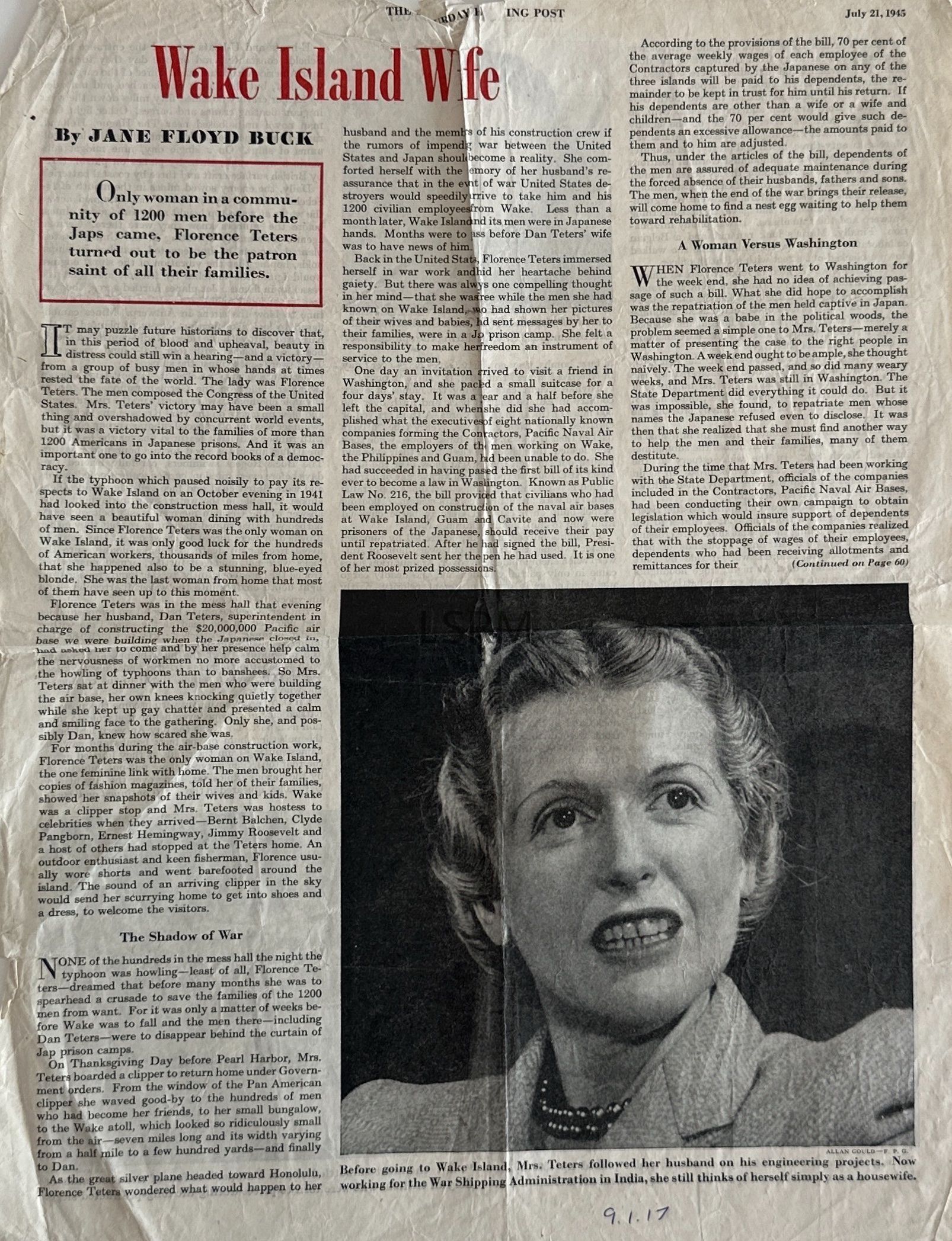 Article from the 21 July, 1945 edition of the Saturday Evening Post about Mrs. Florence Teters and how she got a law passed that provided pay for civilians captured by the Japanese at Wake Island. The second page tells of the battle for Antwerp in the fall of 1944.