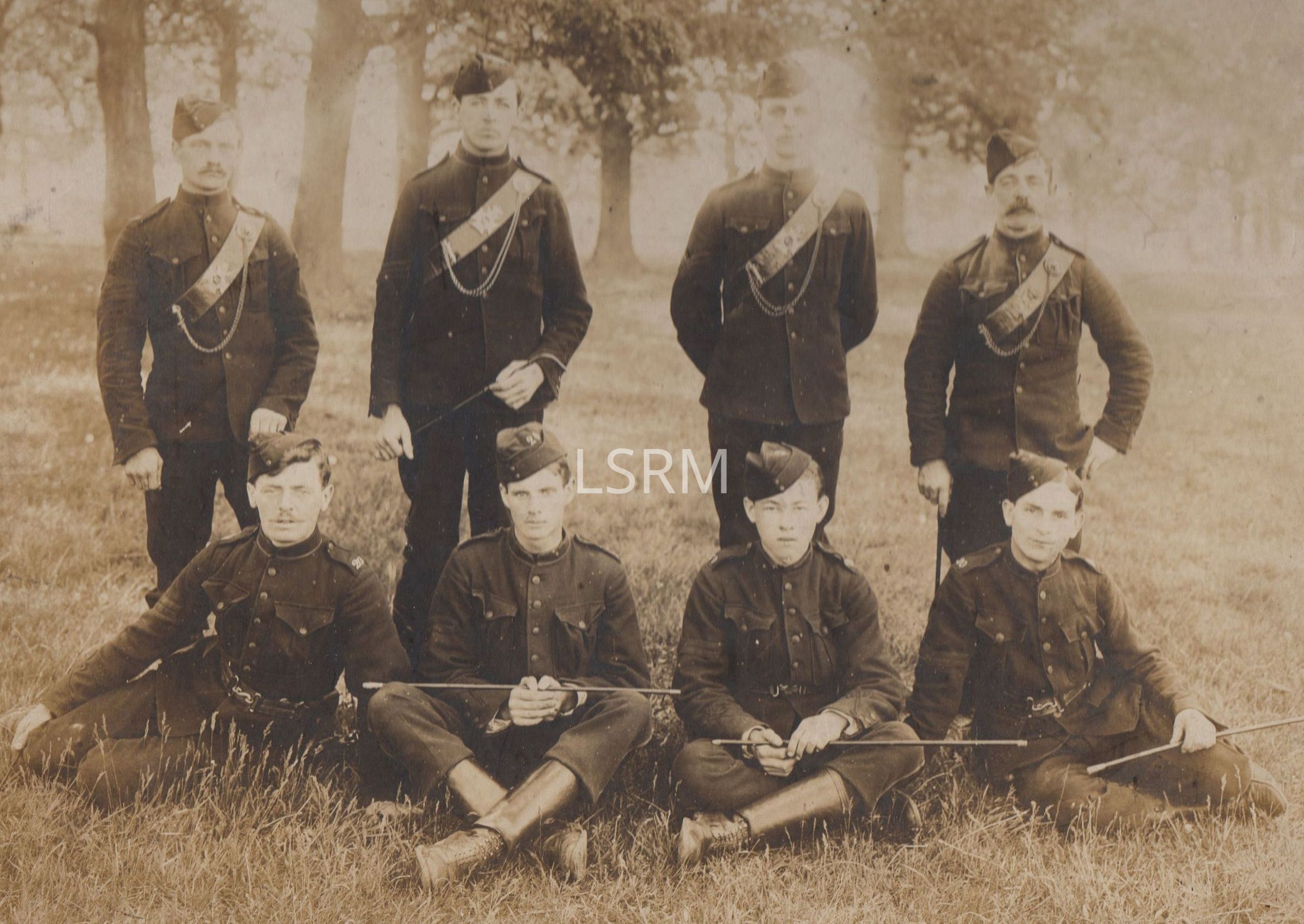 Sepia toned photograph of a group of 8 Non Commissioned Officers (NCOs) of the 20th Halton Bn in uniform in a field in front of trees.Made/Created