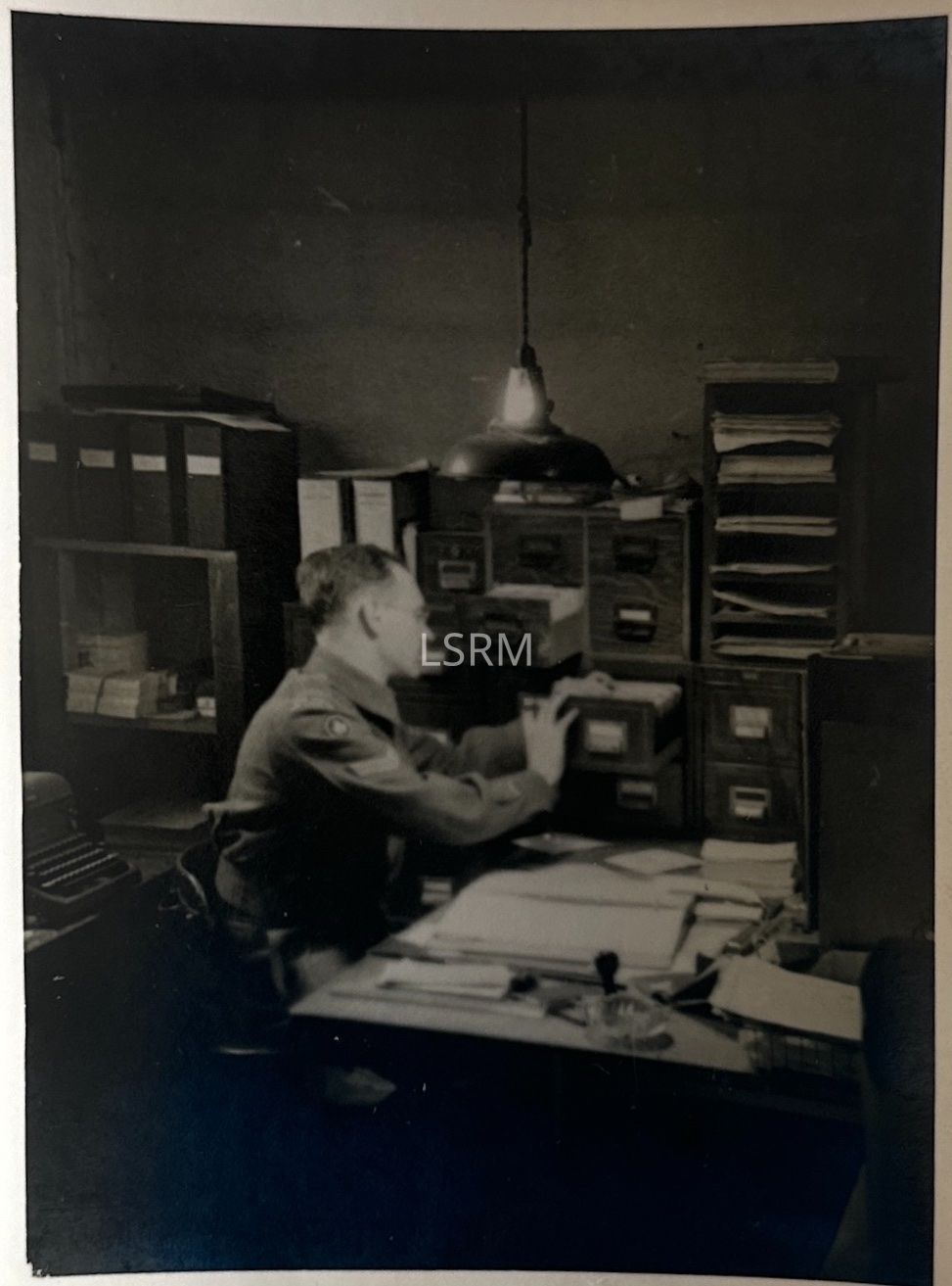 Photograph of a 1st Canadian Army corporal at headquarters working through a filing cabinet. The back of the photograph describes the photo as "1 Cdn P.S.U." "England" "After VE-Day."