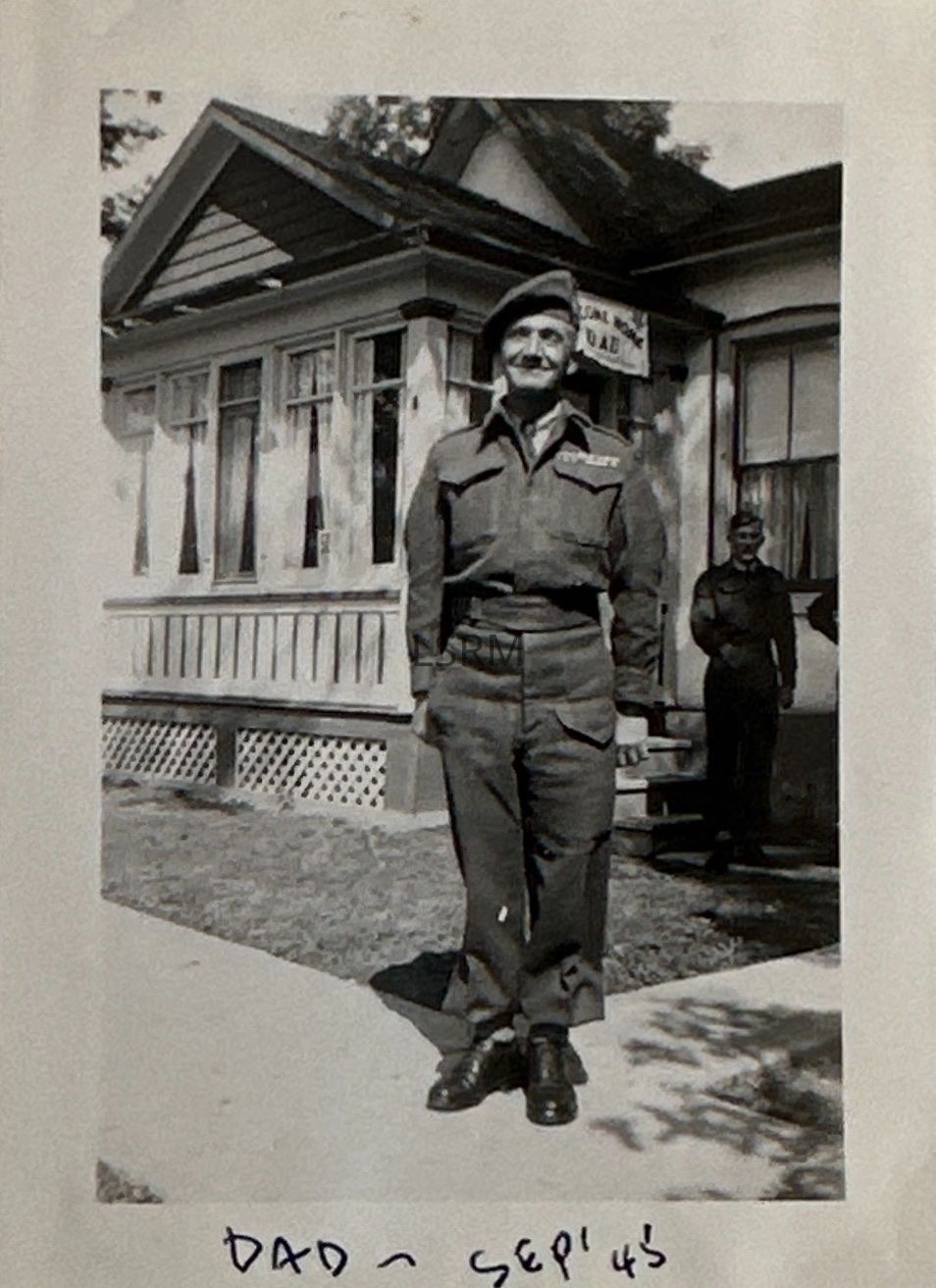 Photograph of Lorne Scots' RSM William “Bill” M. Palmer in September 1945. The photo shows Palmer in his Battledress and Tam o' Shanter in front of a white house and homemade sign which appears with the phrase "Welcome Home Dad." Palmer’s son, Bill Jr. can be seen in the background.Context