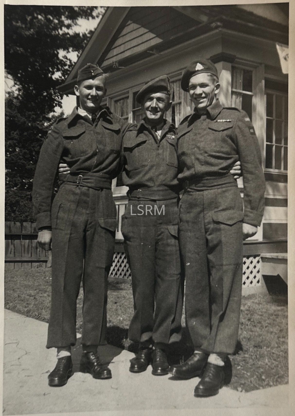 Photograph of three Canadian servicemen. The three men are standing together all wearing Battledress in front of a White House.