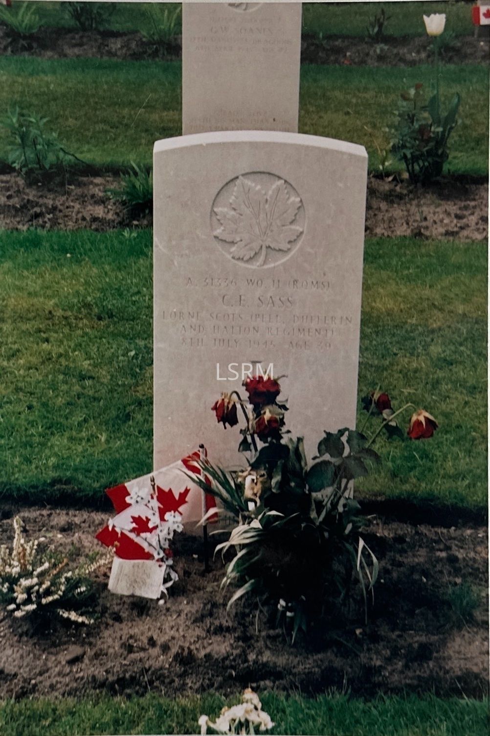 Carl E Sass, from Kitchener Ontario, was a member of the 1st Canadian Corps Defence Company. He had served in Italy and Northwest Europe before being killed in a road accident on the morning of 8 July 1945. He left a wife and two children.