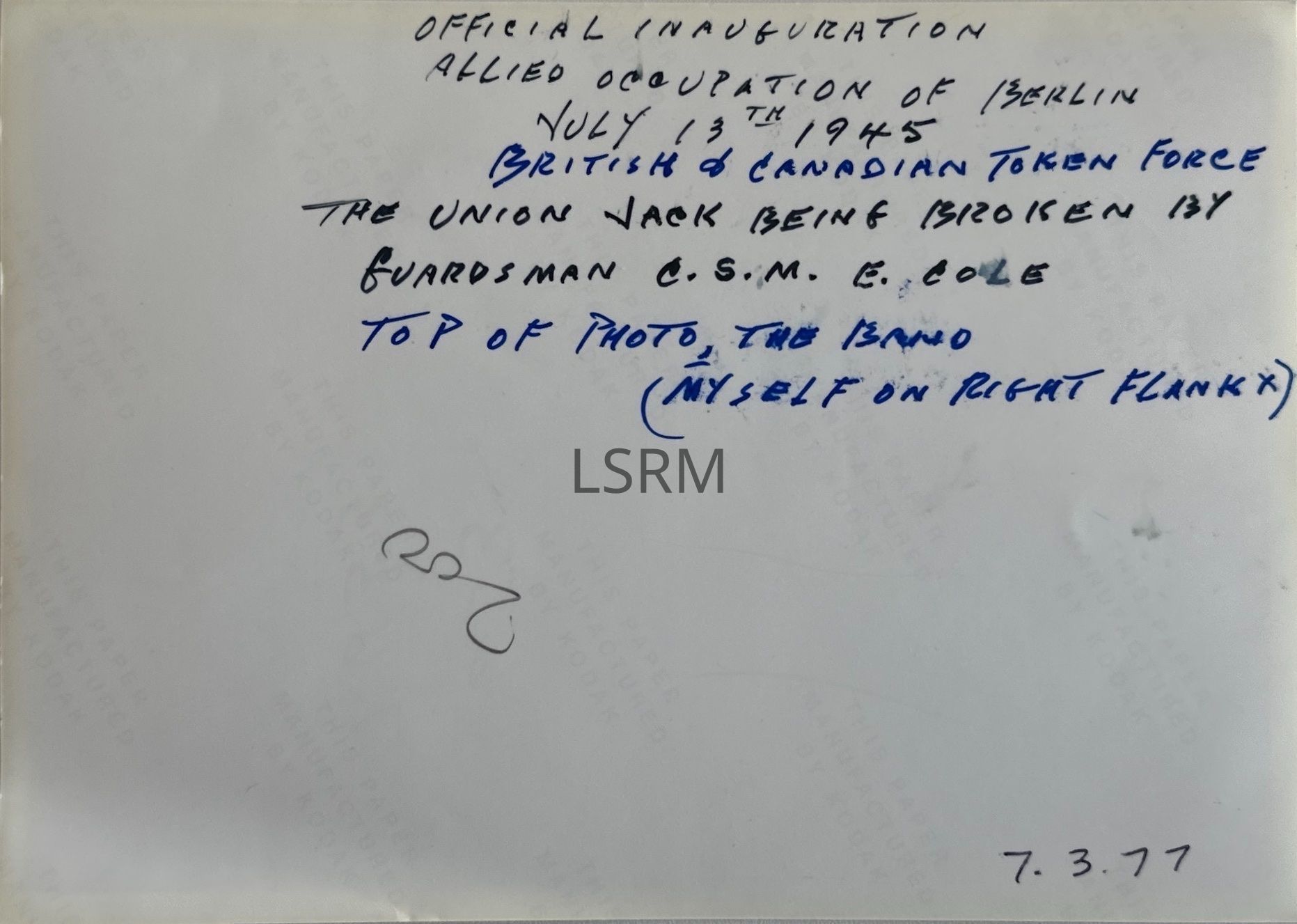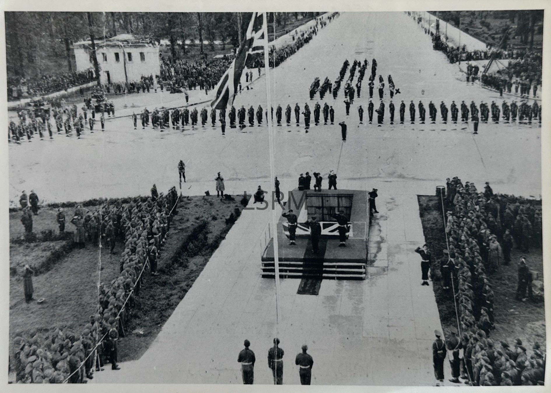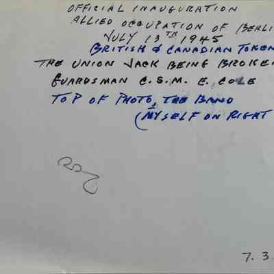 A photograph of the official inauguration of the Allied occupation of Berlin on13 July 1945. The Union Jack is being broken open by CSM E. Cole. The photo captures the token British and Canadian force.