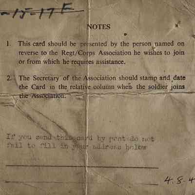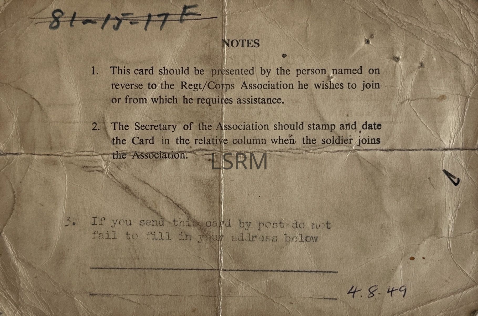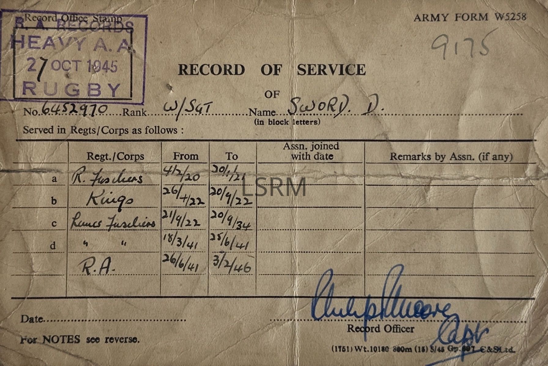 The original record of service card for W/Sgt D. Sword. The card indicates that Sword was a member of the Royal Fusiliers, the King's regiment, the Lancashire Fusiliers, and the Royal Artillery. Signed by the Record Officer in blue ink and stamped in Rugby, UK on 27 October 1945.Use