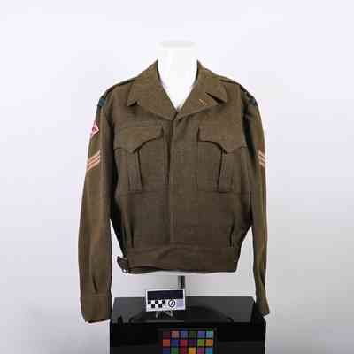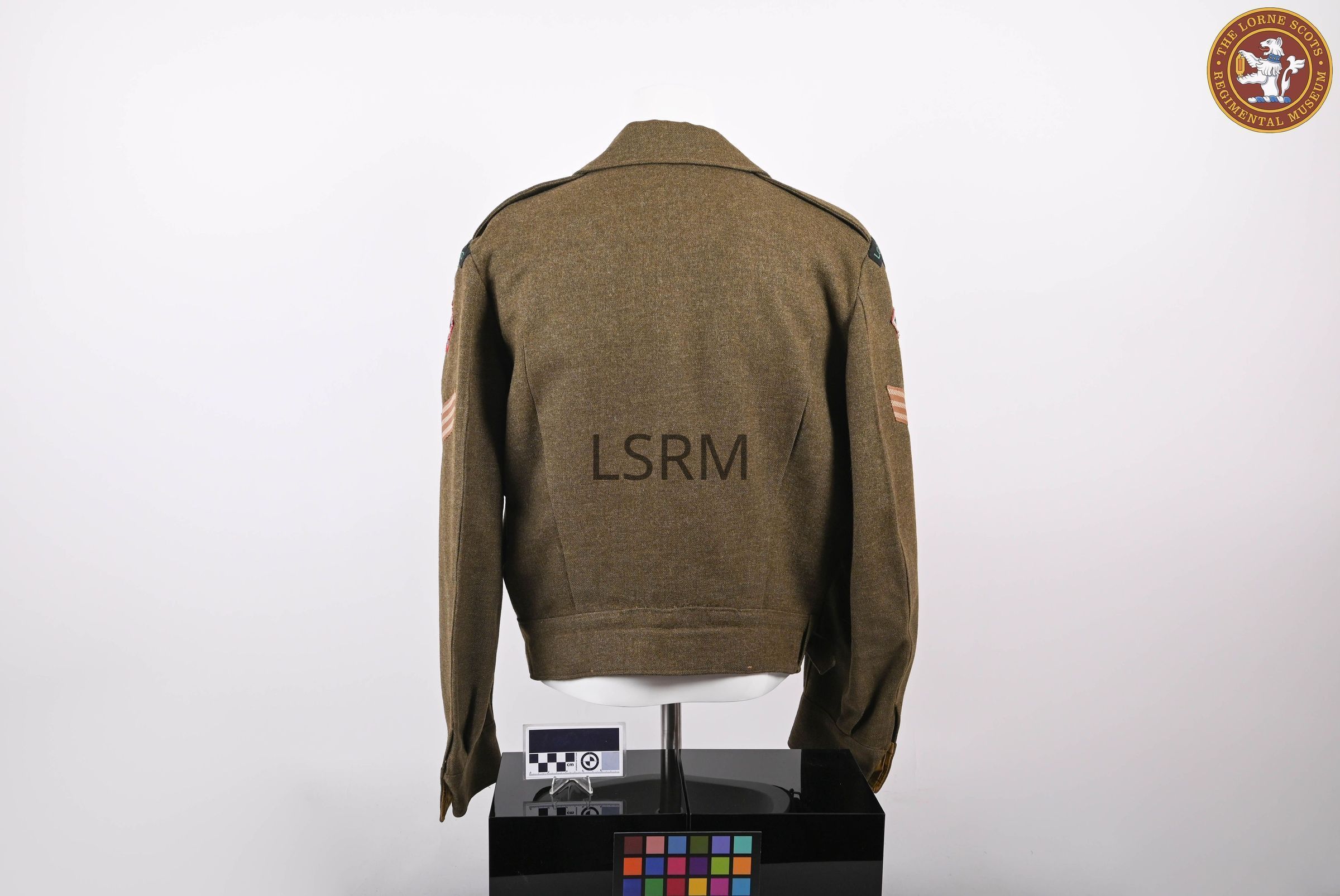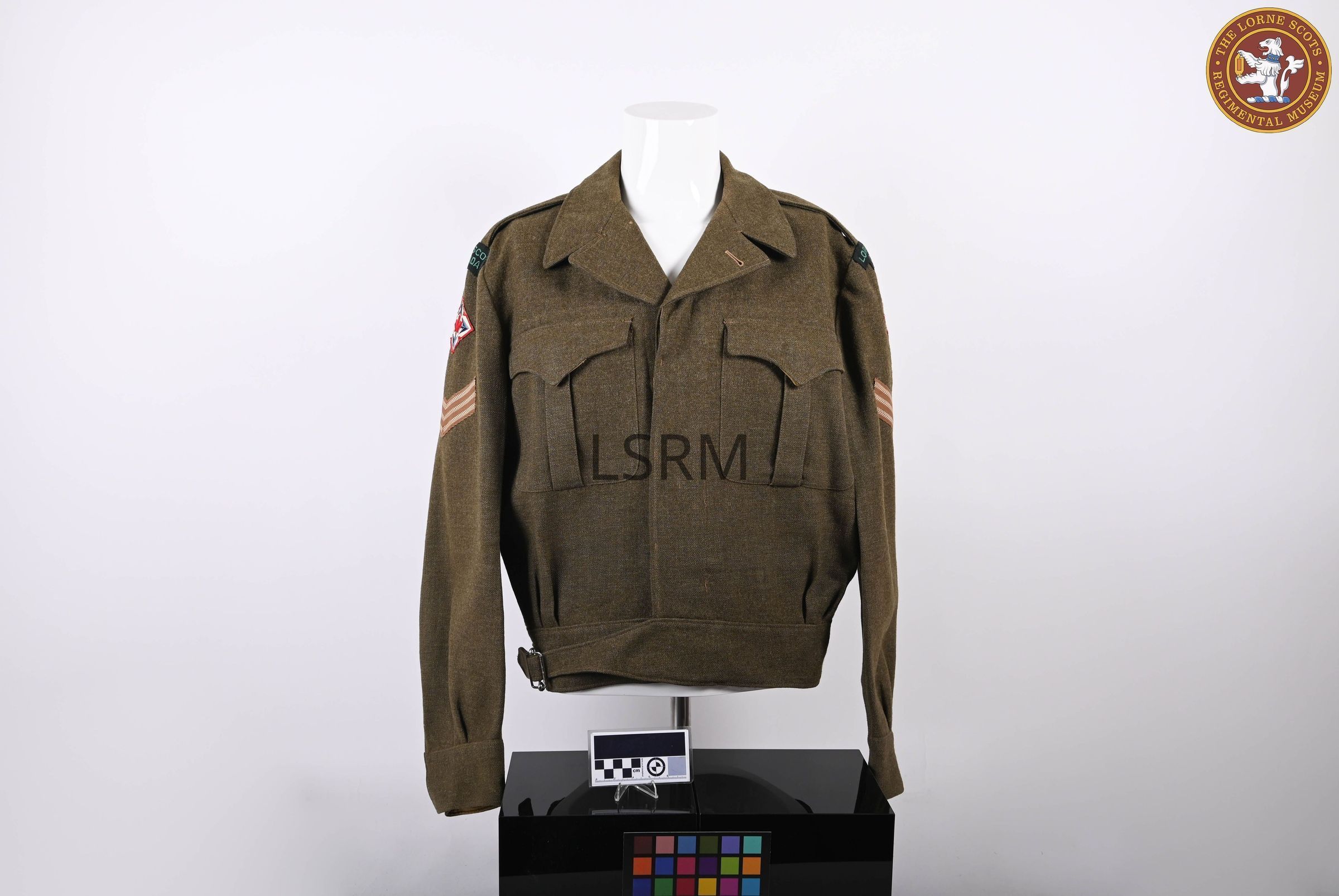 A Canadian Sergeant's Battle Dress Blouse, identified to the Lorne Scots Regiment (green shoulder flashes), with Canadian Mobile Command formation patches.Use