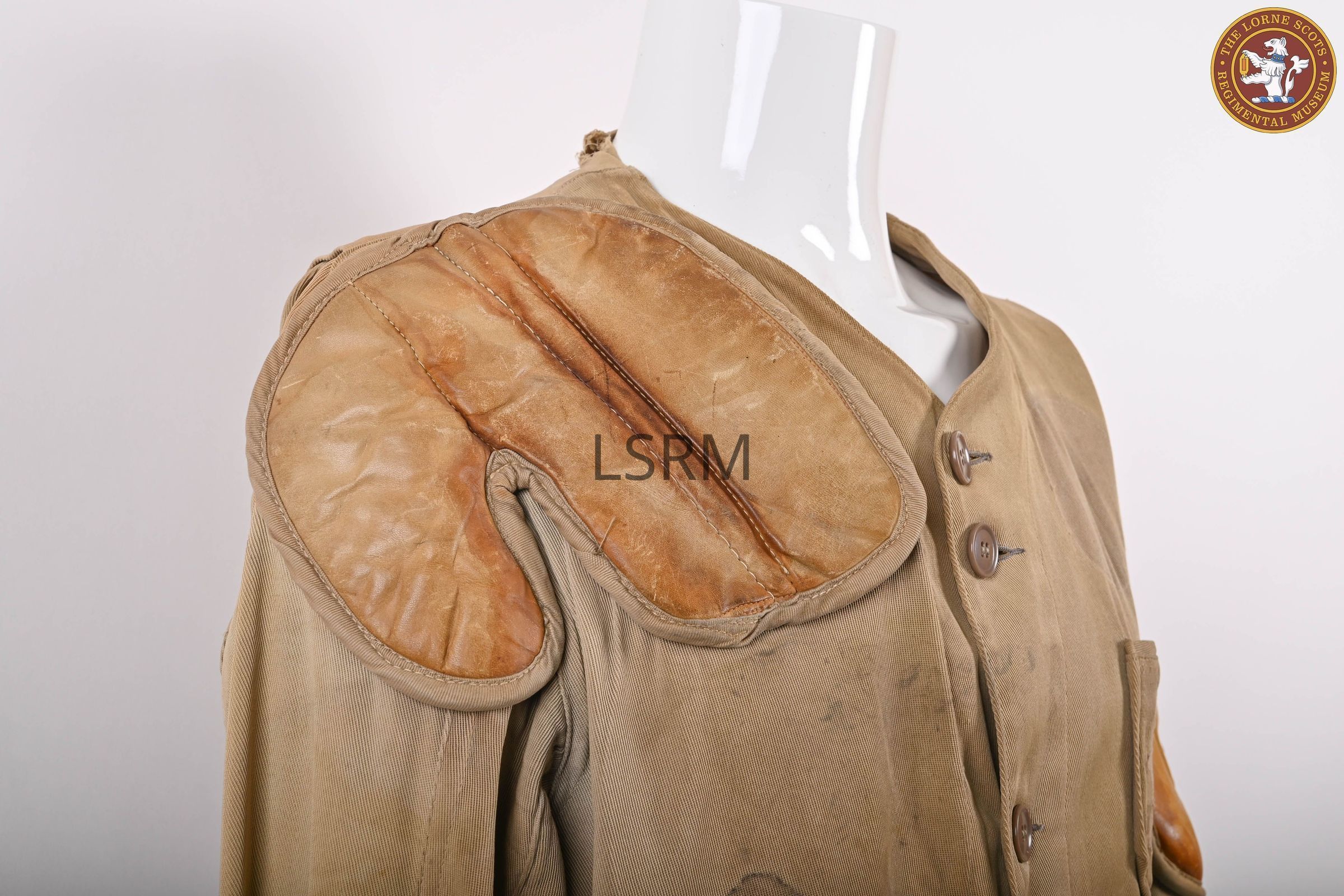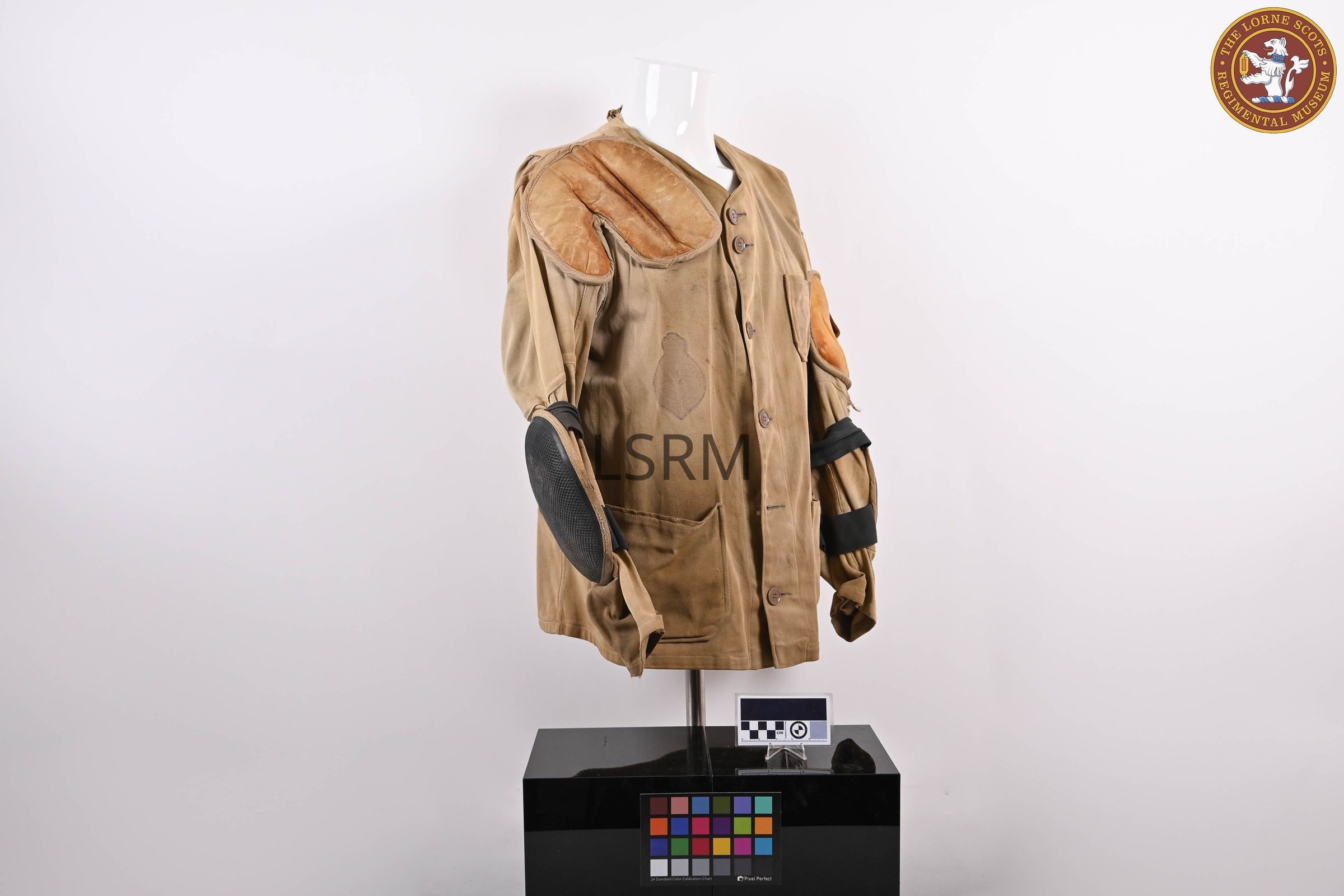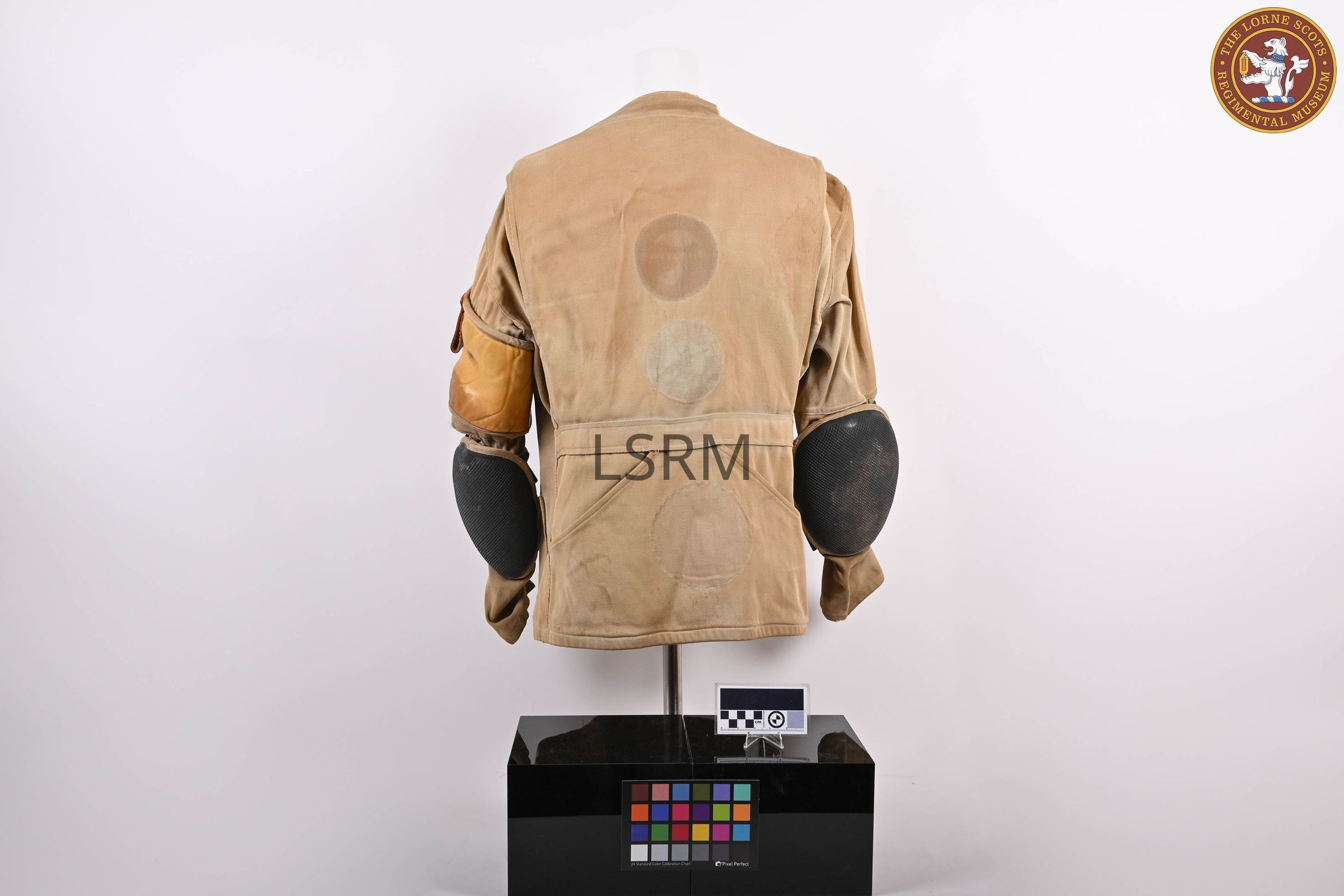 This is a representative type of shooting jacket worn by members of the Regimental Rifle team in competition in the 1960's. The elbow pads, shoulder pad a sling pad all help to minimize movement of the shooters body and rifle. Shooting jackets are not allowed in military competition but are still worn in civilian shooting matches.