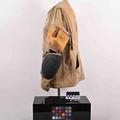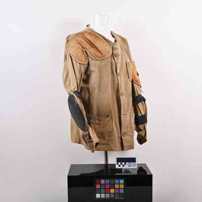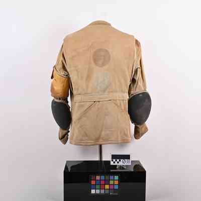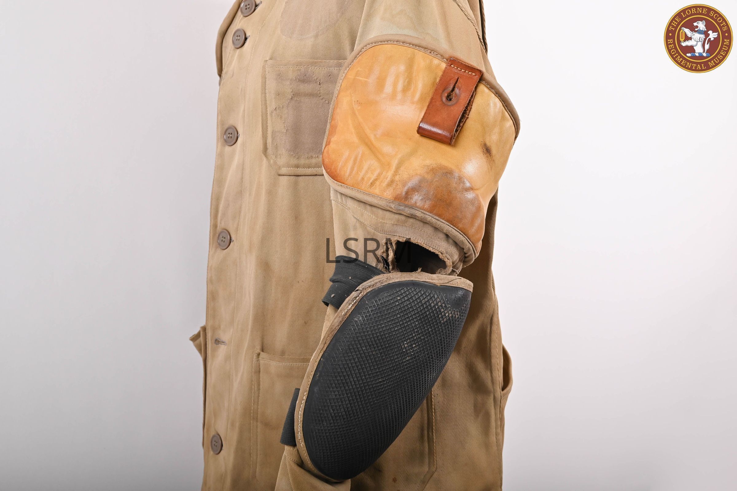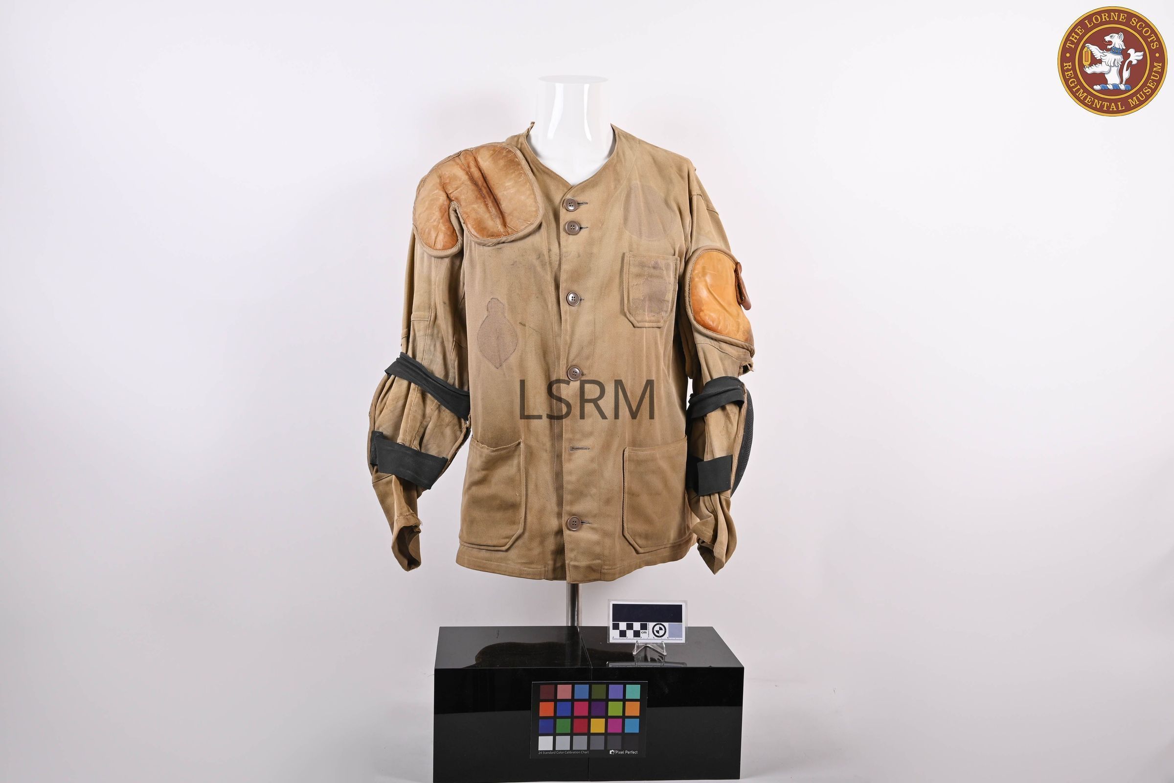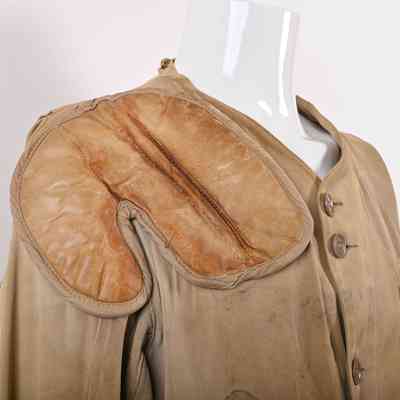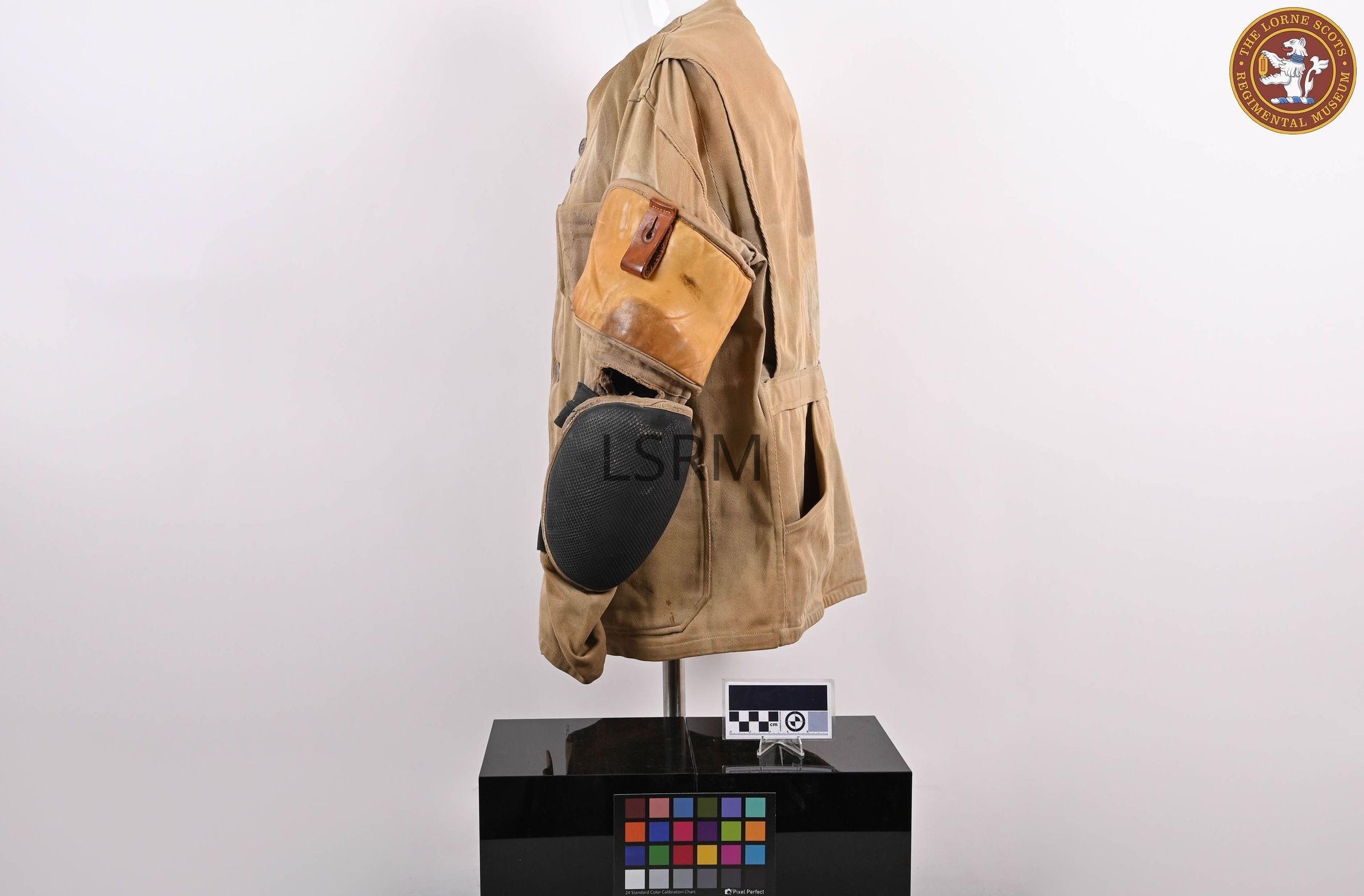 This is a representative type of shooting jacket worn by members of the Regimental Rifle team in competition in the 1960's. The elbow pads, shoulder pad a sling pad all help to minimize movement of the shooters body and rifle. Shooting jackets are not allowed in military competition but are still worn in civilian shooting matches.