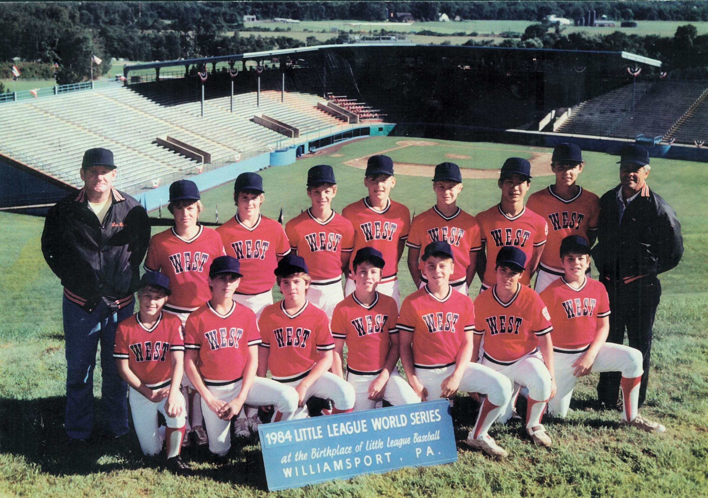 This unique team from Los Gatos went to the World Series in Williamsport, PA in August, 1984 to represent the WEST. Every member of this team was able to hit a home run and was able to pitch. They lost to the SOUTH, (Florida) 2-1, but ended up 5th in the world. Front row from left to right: Joe Hasty, Jason Halladay, Shannon Splaine, Ben Boulware, Dominic Rugani, Mark Borgese, Mike Fisher. Back row from left to right: Coach Leo Berk, Ryan Lotz, Steven Lane, Barrett Scott, Lance Karnan, Bill Berk, Ryan Dohemann, Paul Norquist, and Tony Borgese. Not pictured: Jim Boulware, scorekeeper. SP010Collection