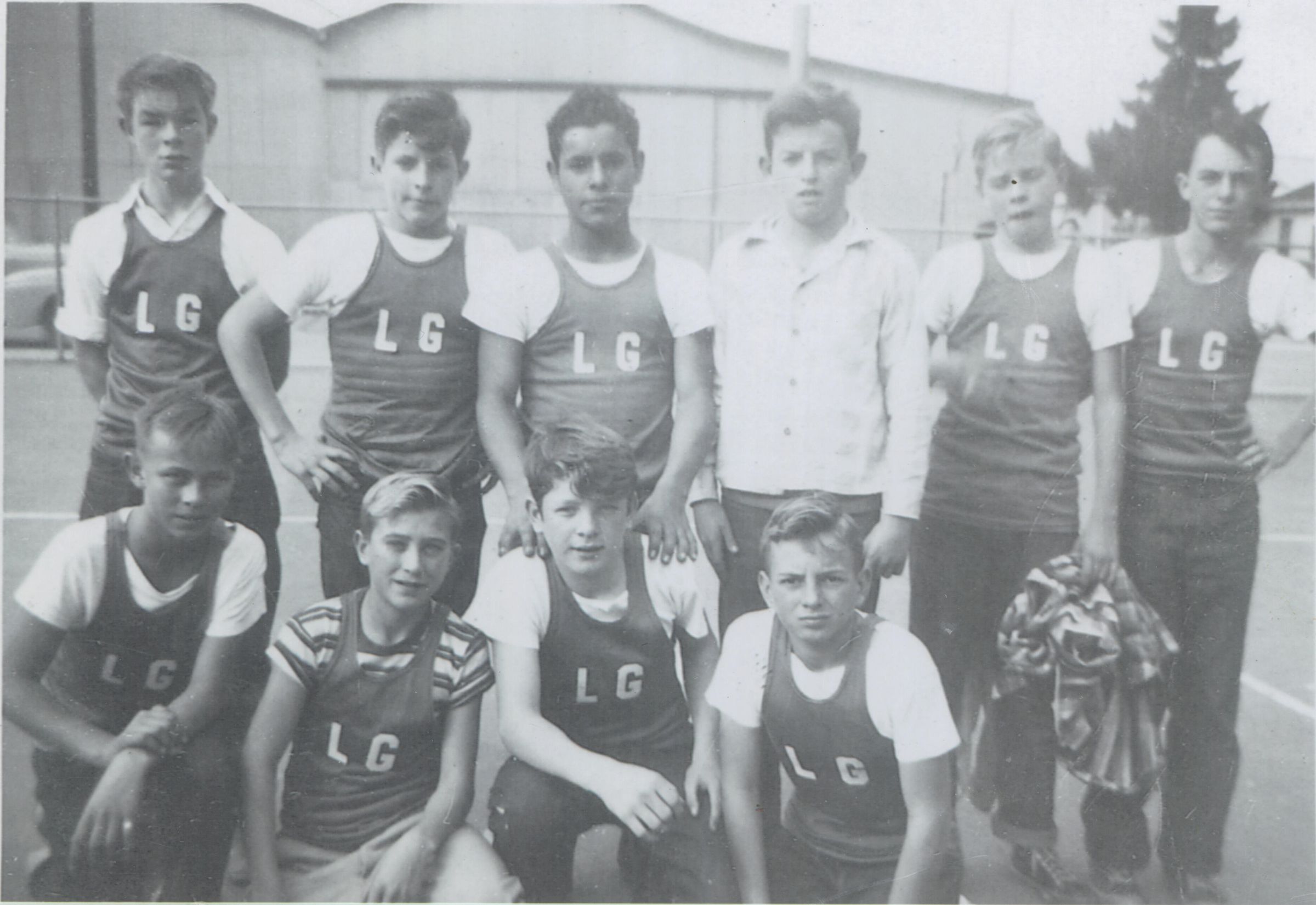 8th graders at University Avenue Grammar School. Top row, left to right: Larry McKinley, Jim Horn, Louie Arena, Norm Saulan, Ron Harder, Gary Magee. Bottom row, left to right: Dick White, Ray Geisick, Jim Johnson, Clayton Bruntz. In background can be seen the Sterling Lumberyard on University Ave. SP013Collection