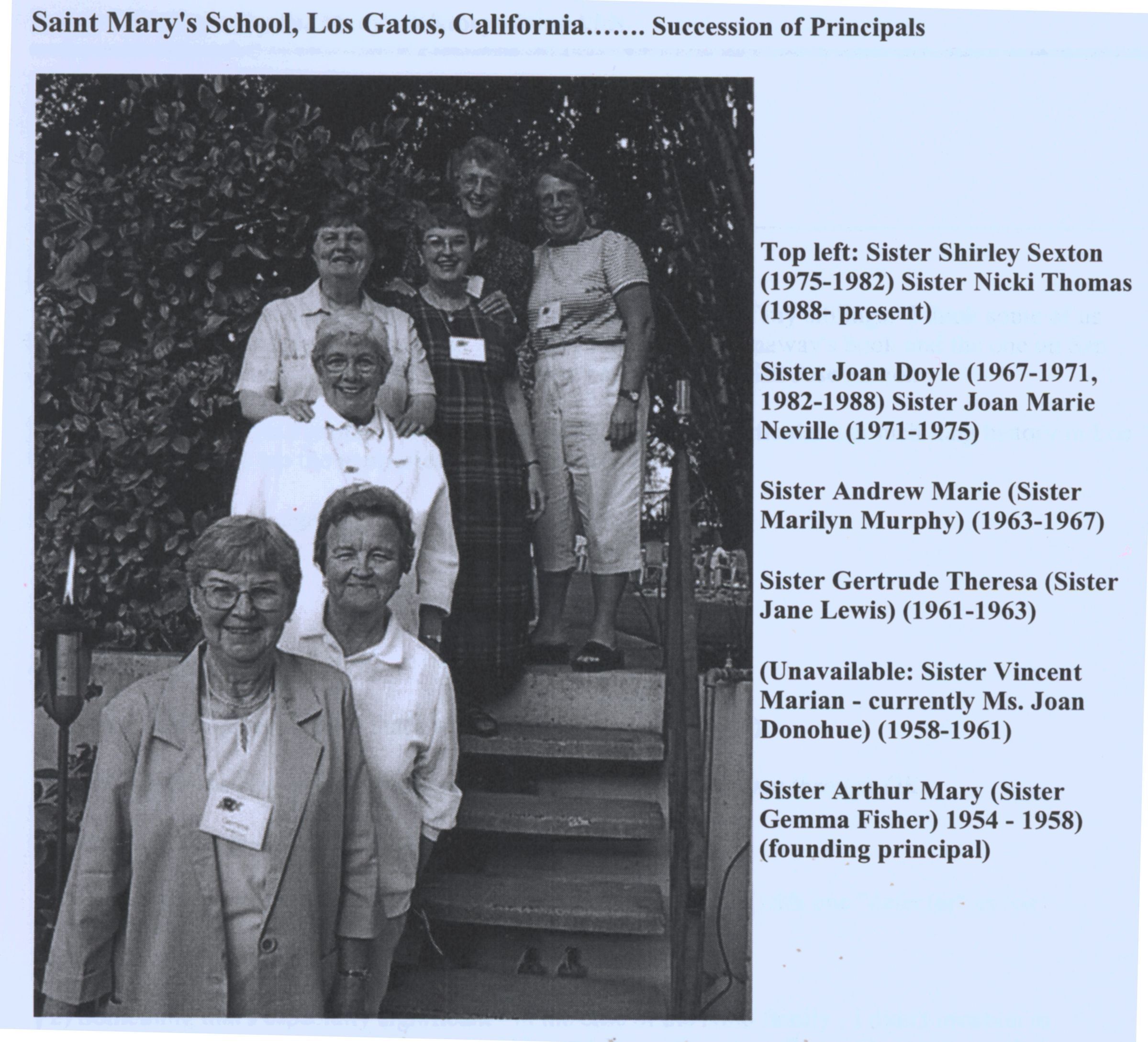 A group photograph of the Principals of St. Mary's School, Los Gatos, reading from bottom to top: Sister Arthur Mary (Sister Gemma Fisher) 1954-1958 (founding principal); Sister Gertrude Theresa (Sister Jane Lewis) 1958-1961; Sister Andrew Marie (Sister Marilyn Murphy) 1963-1967; Sister Joan Doyle 1967-1971, 1982-1988; Sister Joan Marie Neville 1971-1975; Sister Shirley Sexton 1975-1982; Sister Nicki Thomas 1988-present. Sister Vincent Marian (Ms. Joan Donohue) 1958-1961 was not available for this photo. STM002Collection