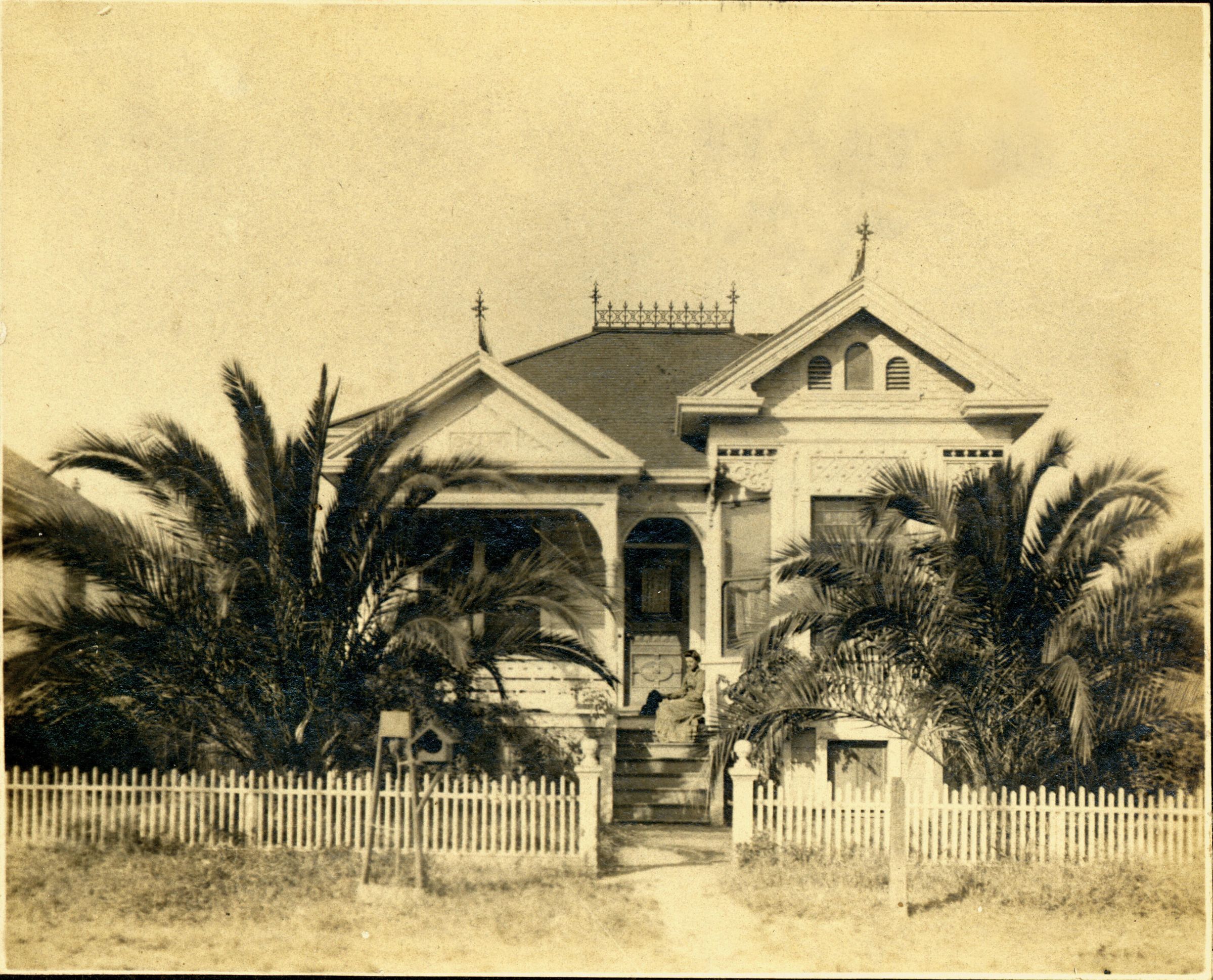 Zephyr A. Macabee invented an effective gopher trap in the basement of his home at 110 Loma Alta Avenue, built in 1894/5. Gophers were causing a great deal of damage to orchard trees, and so Zephyr created the trap using a pair of pliers, some wire and a piece of metal. He obtained a patent for his trap in 1900, and the traps are still manufactured at the same location today. Zephyr's wife Elizabeth is sitting on the front steps with her little dog. MAC006Collection