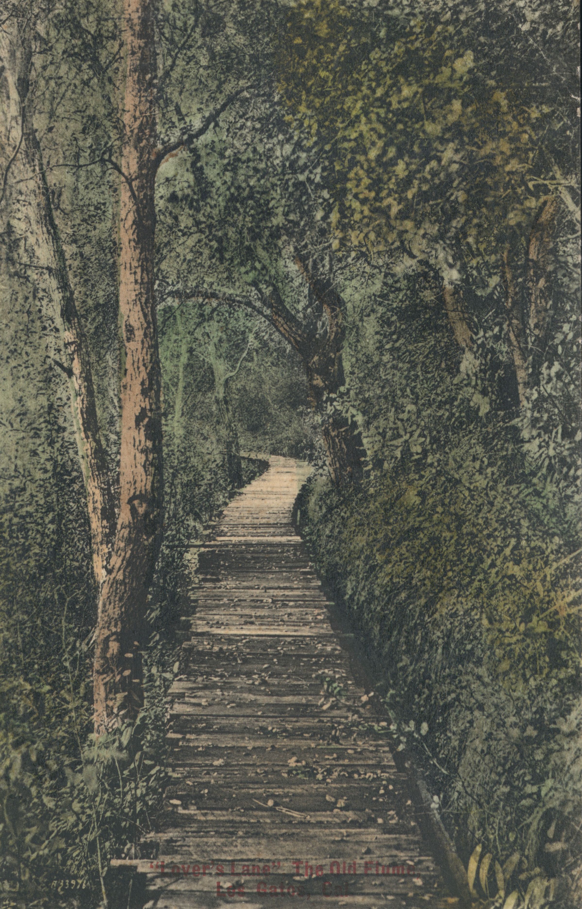In 1871, a wooden flume was built along the east bank of Cats' Canyon in order to pick up water at Jones Dam above Alma and bring it to Los Gatos. While "flume walking" was not built into the design of the structure, it was a popular activity. Sometimes the flume was called "Lovers' Lane." Encounters with wild cats and skunks were frequent. The three-mile long flume was replaced by a galvanized steel aqueduct in the 1930s. MTN099Subject