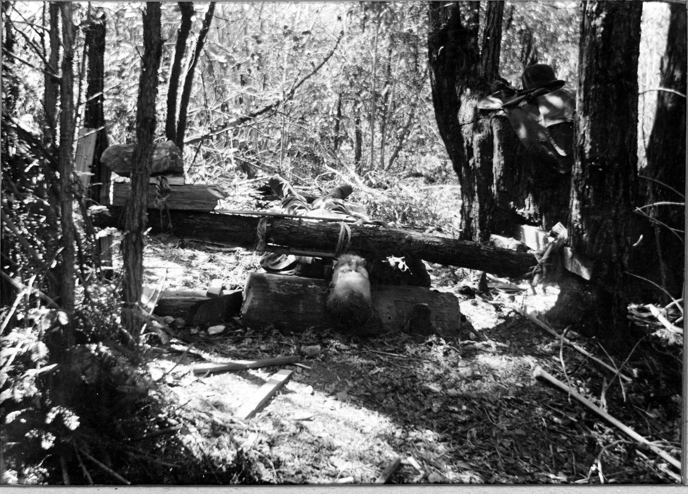 Testimony to the ruggedness and loneliness of life in the 1880s near the little lumber town of Wrights is graphically caputured in the suicide of a French woodsman who fashioned a home-made guillotine to end his own life. The identity of the man is unknown, as is the identity of the photographer. HC000aCollection
