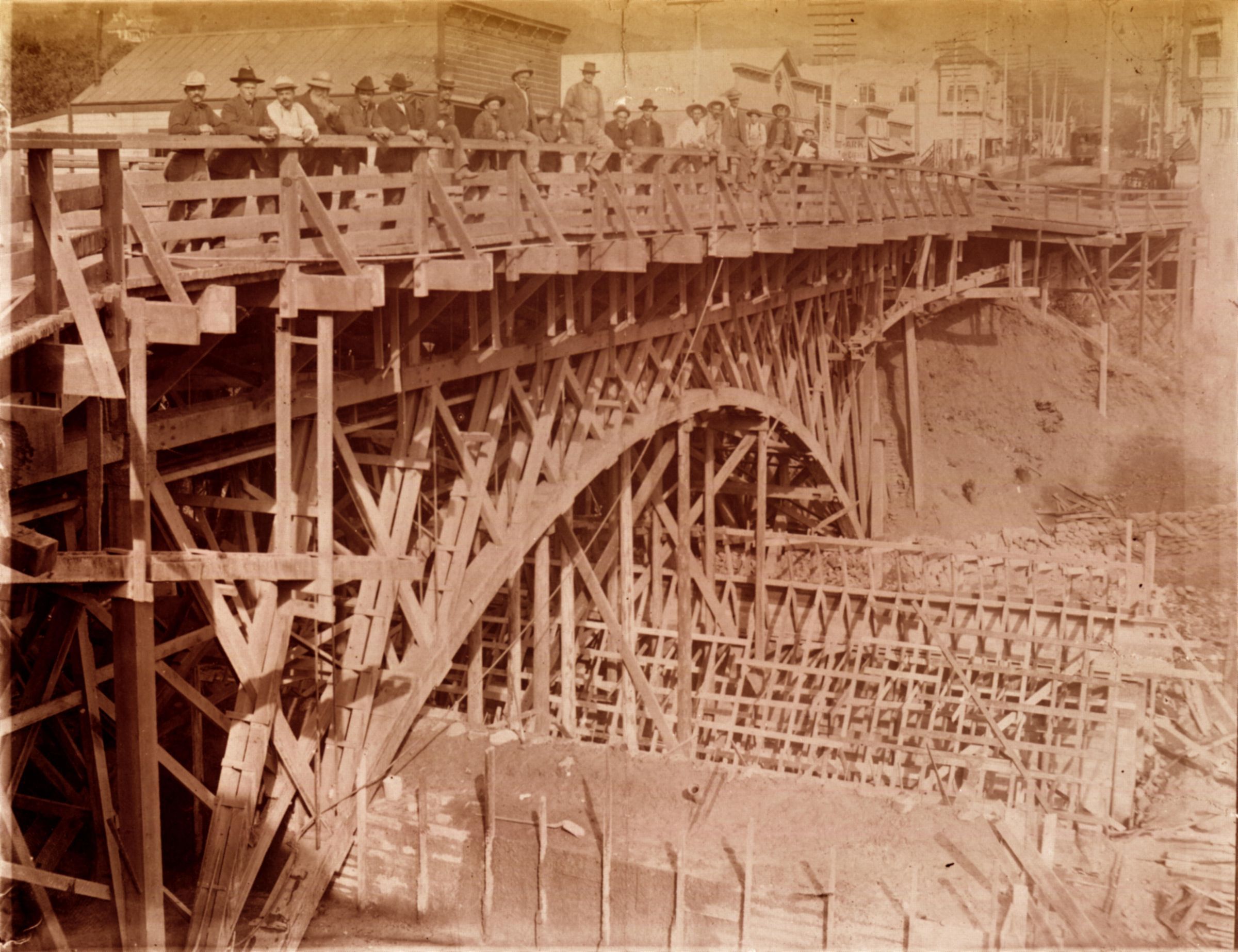 Photograph of the old wooden bridge shortly before it was replaced by a stone and concrete bridge in 1906. Construction forms can be seen for the concrete work. BRG005Collection